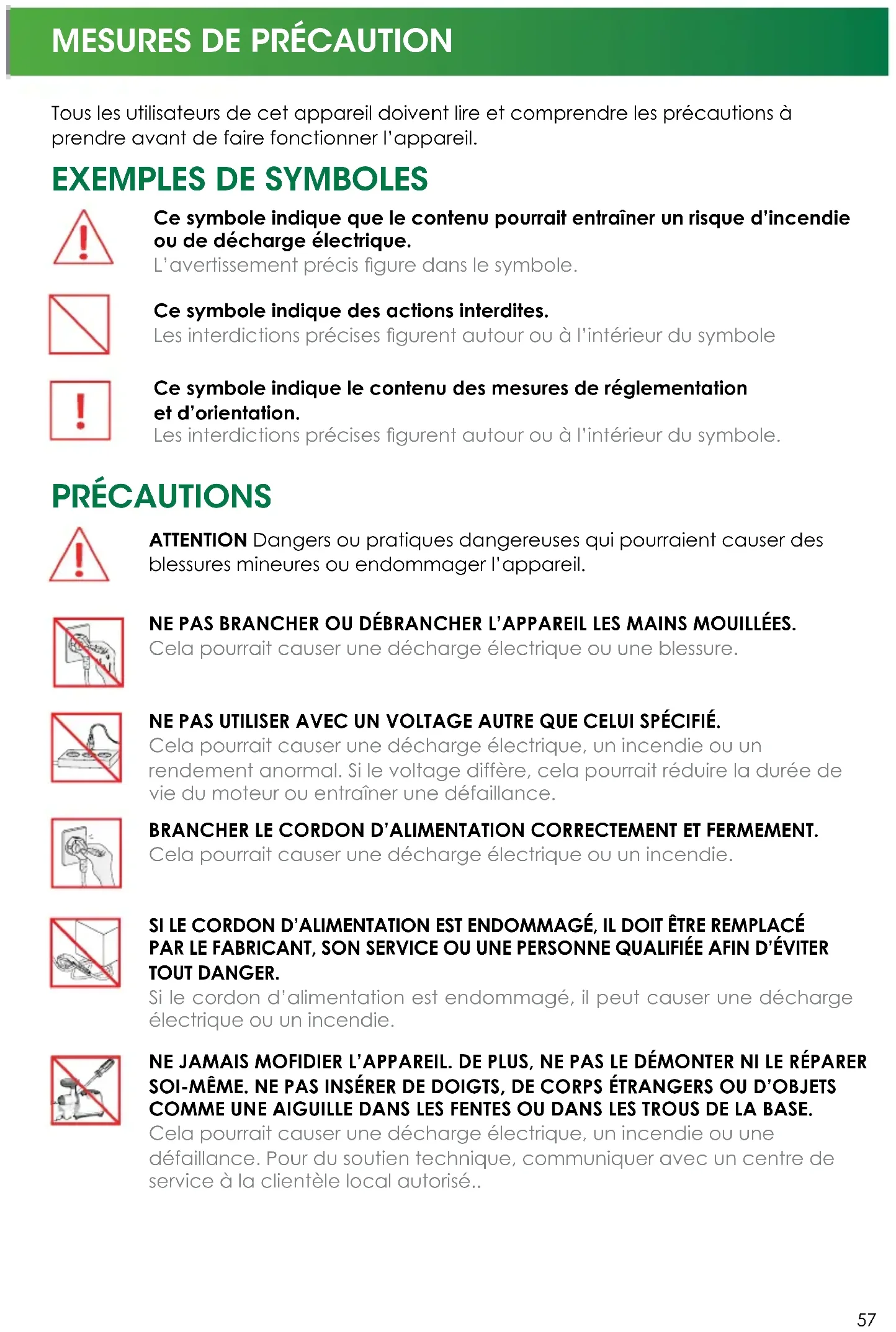 PRÉCAUTIONS ATTENTION Dangers ou pratiques dangereuses qui pourraient causer des blessures mineures ou endommager l’appareil. NE PAS BRANCHER OU DÉBRANCHER L’APPAREIL LES MAINS MOUILLÉES. Cela pourrait causer une décharge électrique ou une blessure. NE PAS UTILISER AVEC UN VOLTAGE AUTRE QUE CELUI SPÉCIFIÉ. Cela pourrait causer une décharge électrique, un incendie ou un rendement anormal. Si le voltage diffère, cela pourrait réduire la durée de vie du moteur ou entraîner une défaillance. BRANCHER LE CORDON D’ALIMENTATION CORRECTEMENT ET FERMEMENT. Cela pourrait causer une décharge électrique ou un incendie. SI LE CORDON D’ALIMENTATION EST ENDOMMAGÉ, IL DOIT ÊTRE REMPLACÉ PAR LE FABRICANT, SON SERVICE OU UNE PERSONNE QUALIFIÉE AFIN D’ÉVITER TOUT DANGER. Si le cordon d’alimentation est endommagé, il peut causer une décharge électrique ou un incendie. NE JAMAIS MOFIDIER L’APPAREIL. DE PLUS, NE PAS LE DÉMONTER NI LE RÉPARER SOI-MÊME. NE PAS INSÉRER DE DOIGTS, DE CORPS ÉTRANGERS OU D’OBJETS COMME UNE AIGUILLE DANS LES FENTES OU DANS LES TROUS DE LA BASE. Cela pourrait causer une décharge électrique, un incendie ou une défaillance. Pour du soutien technique, communiquer avec un centre de service à la clientèle local autorisé.. Ce symbole indique que le contenu pourrait entraîner un risque d’incendie ou de décharge électrique. L’avertissement précis gure dans le symbole. Ce symbole indique des actions interdites. Les interdictions précises gurent autour ou à l’intérieur du symbole Ce symbole indique le contenu des mesures de réglementation et d’orientation. Les interdictions précises gurent autour ou à l’intérieur du symbole. Tous les utilisateurs de cet appareil doivent lire et comprendre les précautions à prendre avant de faire fonctionner l’appareil.58
