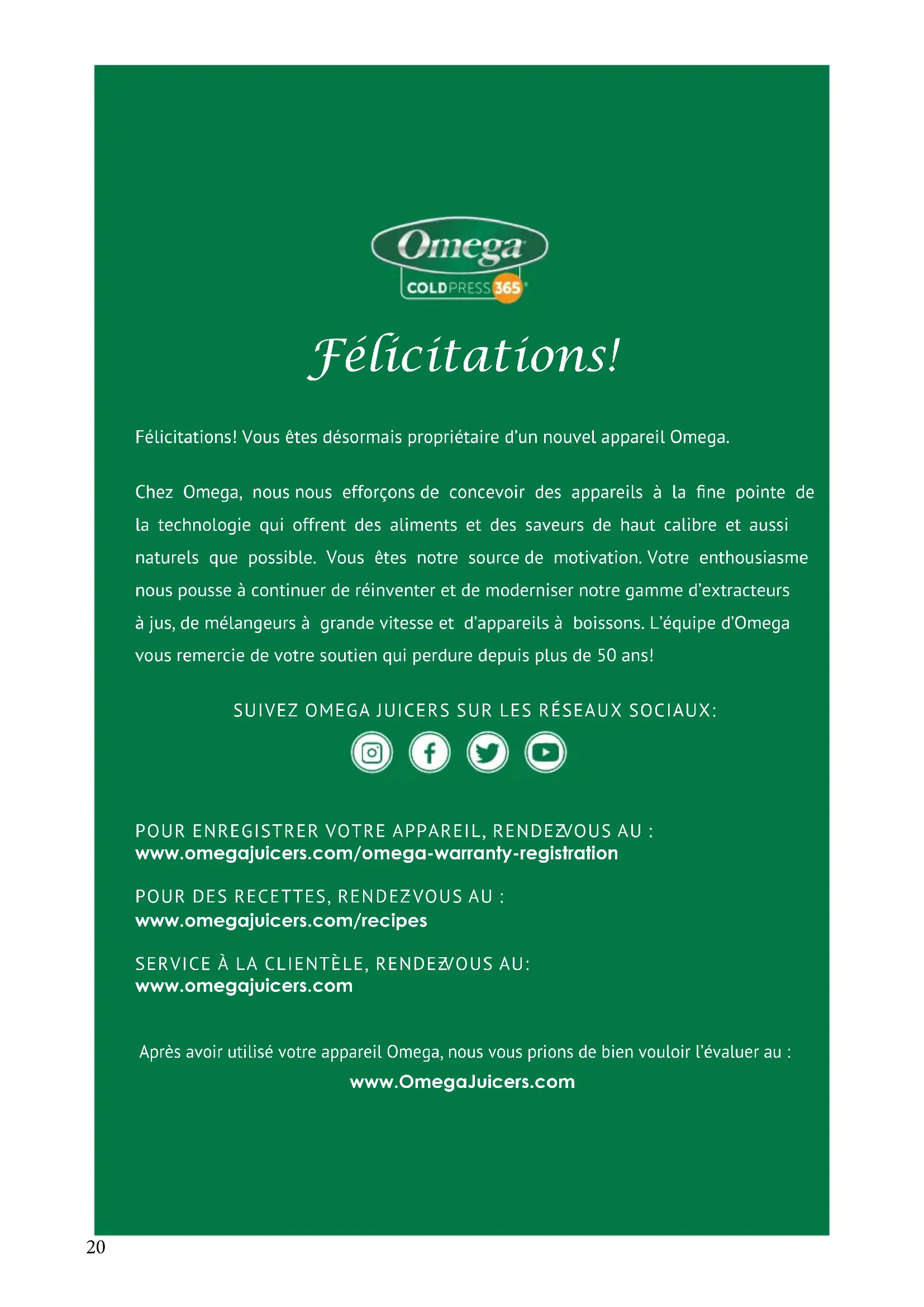 VOUS AU: www.omegajuicers.com Après avoir utilisé votre appareil Omega, nous vous prions de bien vouloir l’évaluer au : www.OmegaJuicers.com SUIVEZ OMEGA JUICERS SUR LES RÉSEAUX SOCIAUX:21