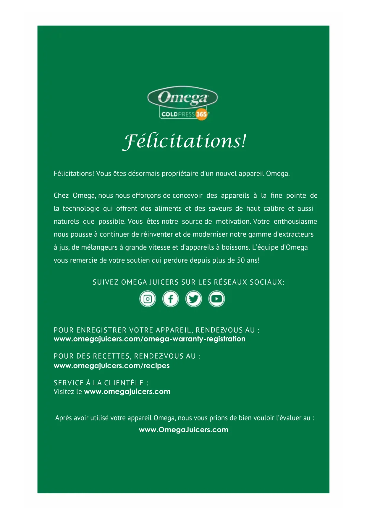VOUS AU : www.omegajuicers.com/recipes SERVICE À LA CLIENTÈLE: Visitez le www.omegajuicers.com Après avoir utilisé votre appareil Omega, nous vous prions de bien vouloir l’évaluer au : www.OmegaJuicers.com SUIVEZ OMEGA JUICERS SUR LES RÉSEAUX SOCIAUX:TABLE OF CONTENTS