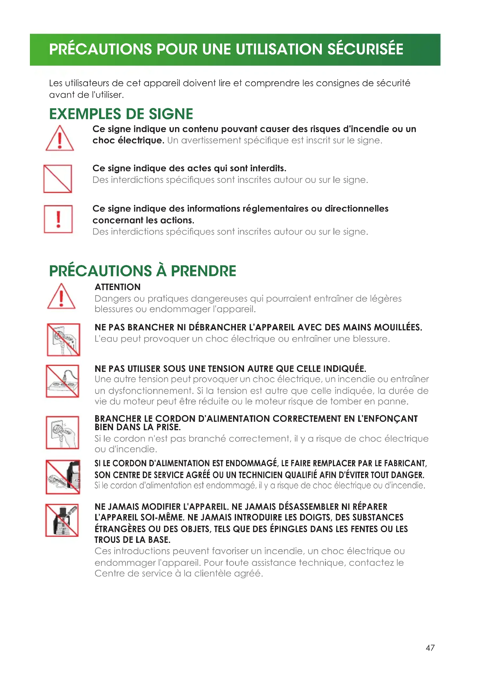 SANS DANGER47 PRÉCAUTIONS POUR UNE UTILISATION SÉCURISÉE ATTENTION Dangers ou pratiques dangereuses qui pourraient entraîner de légères blessures ou endommager l'appareil. Ce signe indique un contenu pouvant causer des risques d'incendie ou un choc électrique. Un avertissement spécique est inscrit sur le signe. Ce signe indique des actes qui sont interdits. Des interdictions spéciques sont inscrites autour ou sur le signe. Ce signe indique des informations réglementaires ou directionnelles concernant les actions. Des interdictions spéciques sont inscrites autour ou sur le signe. NE PAS BRANCHER NI DÉBRANCHER L'APPAREIL AVEC DES MAINS MOUILLÉES. L'eau peut provoquer un choc électrique ou entraîner une blessure. NE PAS UTILISER SOUS UNE TENSION AUTRE QUE CELLE INDIQUÉE. Une autre tension peut provoquer un choc électrique, un incendie ou entraîner un dysfonctionnement. Si la tension est autre que celle indiquée, la durée de vie du moteur peut être réduite ou le moteur risque de tomber en panne. BRANCHER LE CORDON D'ALIMENTATION CORRECTEMENT EN L'ENFONÇANT BIEN DANS LA PRISE. Si le cordon n'est pas branché correctement, il y a risque de choc électrique ou d'incendie. SI LE CORDON D'ALIMENTATION EST ENDOMMAGÉ, LE FAIRE REMPLACER PAR LE FABRICANT, SON CENTRE DE SERVICE AGRÉÉ OU UN TECHNICIEN QUALIFIÉ AFIN D'ÉVITER TOUT DANGER. Si le cordon d'alimentation est endommagé, il y a risque de choc électrique ou d'incendie. NE JAMAIS MODIFIER L'APPAREIL. NE JAMAIS DÉSASSEMBLER NI RÉPARER L'APPAREIL SOI-MÊME. NE JAMAIS INTRODUIRE LES DOIGTS, DES SUBSTANCES ÉTRANGÈRES OU DES OBJETS, TELS QUE DES ÉPINGLES DANS LES FENTES OU LES TROUS DE LA BASE. Ces introductions peuvent favoriser un incendie, un choc électrique ou endommager l'appareil. Pour toute assistance technique, contactez le Centre de service à la clientèle agréé. Les utilisateurs de cet appareil doivent lire et comprendre les consignes de sécurité avant de l'utiliser.