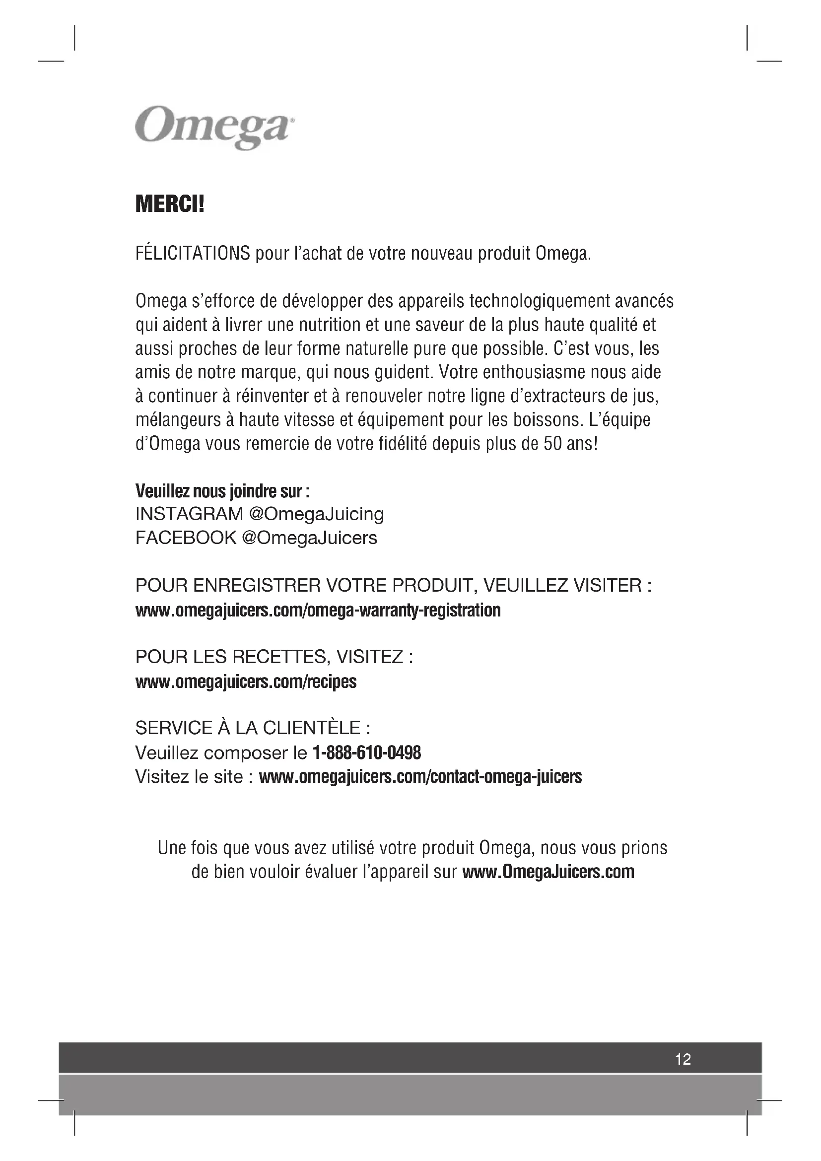 FORCE. TROUBLESHOOTING CONTACT US: Customer Service: 1-888-610-0498 Online: www.OmegaJuicers.com/contact-omega-juicers12 CONTENU Merci ___________________________________________________ 12 Mesures de protection importantes ____________________________ 13 Pièces et fonctions _________________________________________ 16 Mode d’emploi ____________________________________________ 17 Entretien _________________________________________________ 19 Indice de sécurité __________________________________________ 20 Dépannage _______________________________________________ 2012 MERCI! FÉLICITATIONS pour l’achat de votre nouveau produit Omega. Omega s’efforce de développer des appareils technologiquement avancés qui aident à livrer une nutrition et une saveur de la plus haute qualité et aussi proches de leur forme naturelle pure que possible. C’est vous, les amis de notre marque, qui nous guident. Votre enthousiasme nous aide à continuer à réinventer et à renouveler notre ligne d’extracteurs de jus, mélangeurs à haute vitesse et équipement pour les boissons. L’équipe d’Omega vous remercie de votre fidélité depuis plus de 50ans! Veuillez nous joindre sur: INSTAGRAM @OmegaJuicing FACEBOOK @OmegaJuicers POUR ENREGISTRER VOTRE PRODUIT, VEUILLEZ VISITER : www.omegajuicers.com/omega-warranty-registration POUR LES RECETTES, VISITEZ : www.omegajuicers.com/recipes SERVICE À LA CLIENTÈLE : Veuillez composer le 1-888-610-0498 Visitez le site : www.omegajuicers.com/contact-omega-juicers Une fois que vous avez utilisé votre produit Omega, nous vous prions de bien vouloir évaluer l’appareil sur www.OmegaJuicers.com13