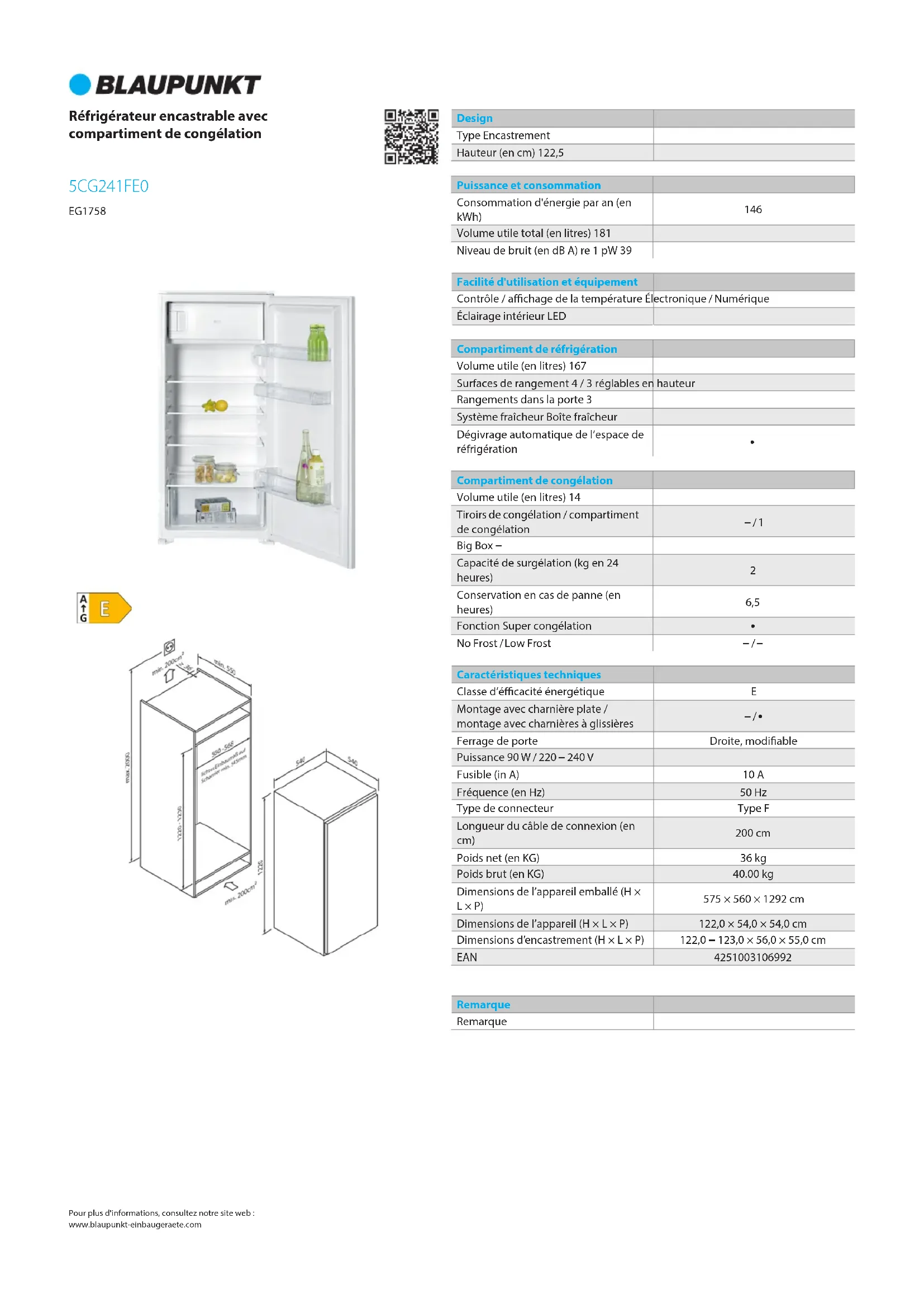 Ferrage de porte Droite, modiable Puissance 90 W / 220 – 240 V Fusible (in A) 10 A Fréquence (en Hz) 50 Hz Type de connecteur Type F Longueur du câble de connexion (en cm) 200 cm Poids net (en KG) 36 kg Poids brut (en KG) 40.00 kg Dimensions de l’appareil emballé (H × L × P) 575 × 560 × 1292 cm Dimensions de l’appareil (H × L × P) 122,0 × 54,0 × 54,0 cm Dimensions d’encastrement (H × L × P) 122,0 – 123,0 × 56,0 × 55,0 cm EAN 4251003106992 Remarque Remarque Pour plus d'informations, consultez notre site web : www.blaupunkt-einbaugeraete.com