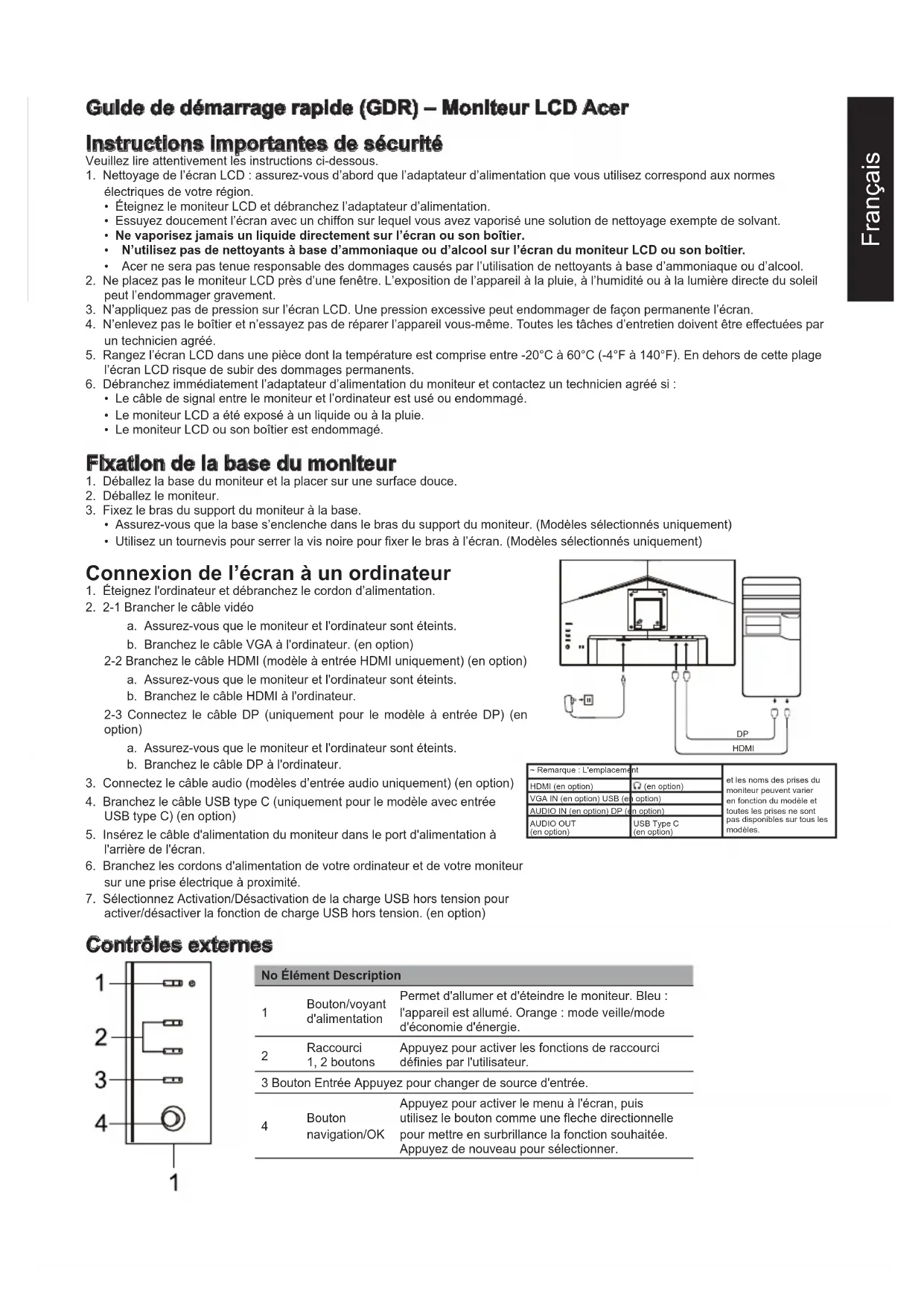 activer/désactiver la fonction de charge USB hors tension. (en option) ~ Remarque : L'emplacement et les noms des prises du moniteur peuvent varier en fonction du modèle et toutes les prises ne sont pas disponibles sur tous les modèles. HDMI (en option) (en option) VGA IN (en option) USB (en option) AUDIO IN (en option) DP (en option) AUDIO OUT (en option) USB Type C (en option) Contrôles externes No Élément Description