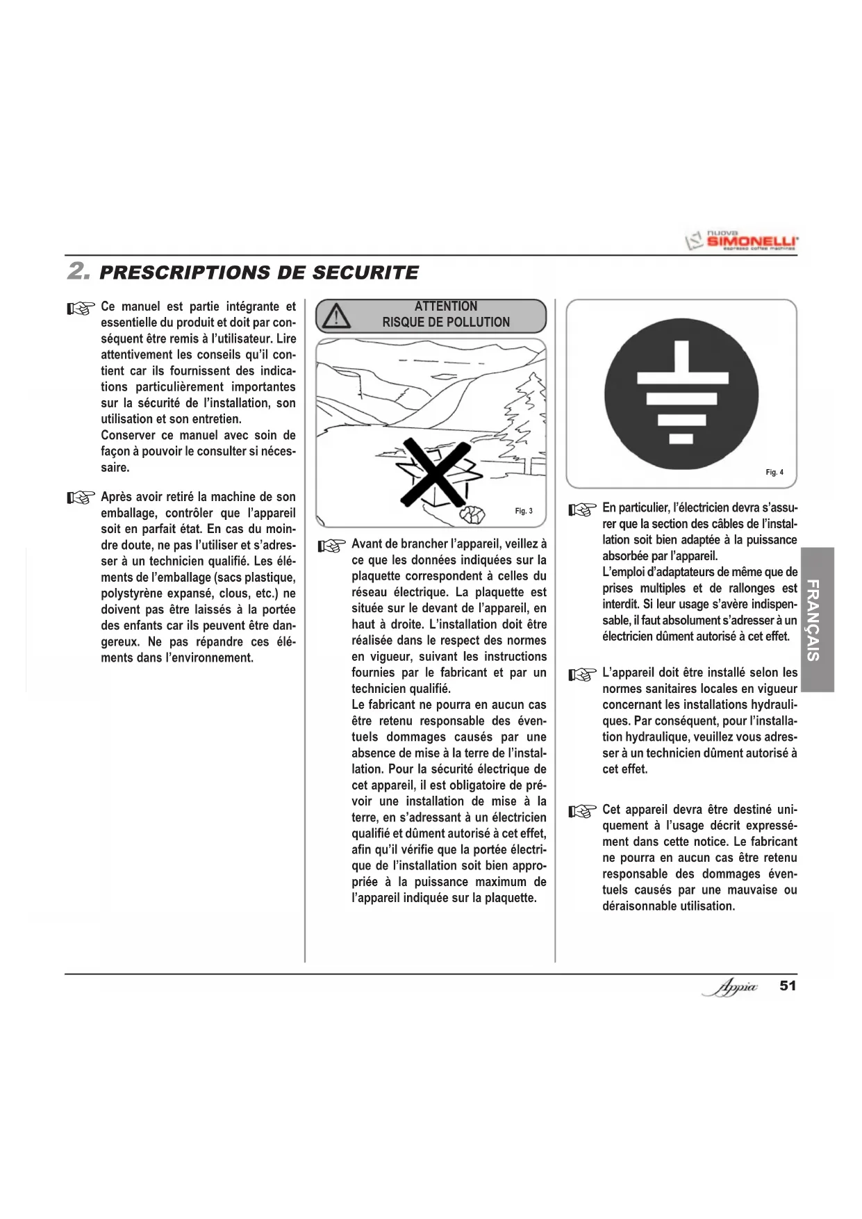 4_Appia2_3GR_UK.qxp 21-04-2006 11:36 Pagina 4445 FRANÇAIS Rel. 01 - 2006 Félicitations, Avec l’achat du modèle vous avez fait un excellent achat. vous avez fait un excellent choix. L’achat d’une machine à café express professionnelle regroupe plusieurs facteurs de sélection: le nom du Constructeur, les caractéristiques des fonc- tions de la machine, la fiabilité technique, la qualité et la rapidité du service après-vente, le coût. Vous avez donc certainement évalué tous ces critè- res avant de décider de choisir le modèle . Vous avez choisi le meilleur produit et nous sommes certains que vous le découvrirez à chaque café et à chaque cappuccino que vous boirez. Et vous apprécierez la facilité et la rapidité d’emploi du modèle . Si cet achat est le premier achat d’une machine Nuova Simonelli, vous êtes le bienvenu dans le monde de la haute cafétéria; si, par contre, vous fai- tes déjà partie de notre Clientèle, nous sommes flattés par votre fidélité, et nous vous remercions de préférer nos produits. Salutations distinguées, Nuova Simonelli s.r.l. 5_Appia2_3GR_F.qxp 21-04-2006 11:38 Pagina 4546 FRANÇAIS