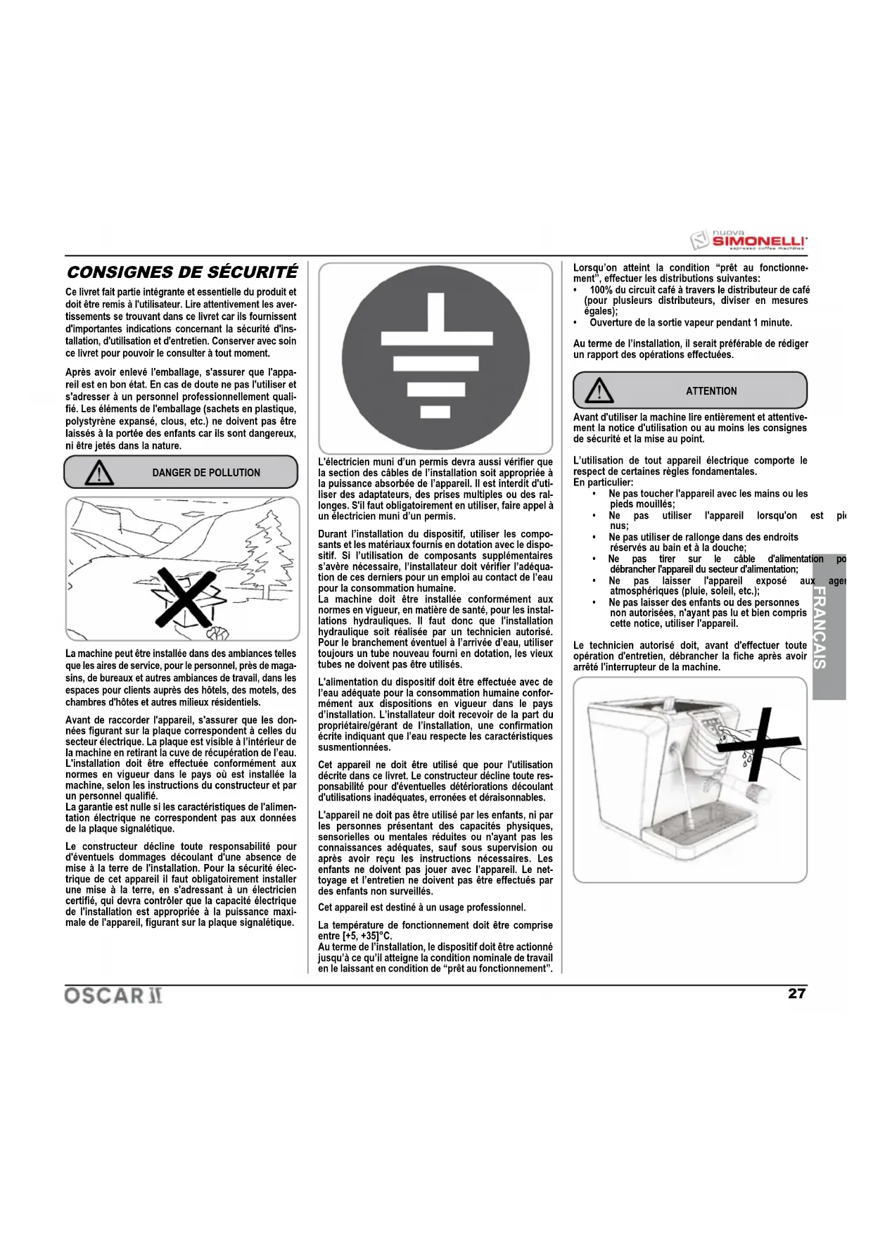 FRANÇAIS Compliments et merci d’avoir choisi notre machine Oscar II. Nous vous invitons à lire attentivement toutes les indications et conseils qui suivent afin d’installer correctement votre machine. Nous l’avons conçue pour offrir l’expérience d’un bon café à quiconque prépa- rera et savourera une boisson à base d’expresso. En l’utilisant, vous découvrirez combien la préparation est facile et, avec le temps, vous rendrez compte aussi du peu d’entretien nécessaire. Une chose est certaine: Oscar II sera le “protagoniste” de votre angle “bar” chez vous ou au bureau. Nuova Simonelli S.p.a. Les marques internationales d'approbation certifient que toutes les machines ont été soumises à des tests et à des contrôles sévères. POIDS BRUT POIDS NET Nbr. GROUPES PUIS. THERMIQUE VOLTS/Hz 1200 W 17 Kg. 37Lb 14 Kg. 31Lb