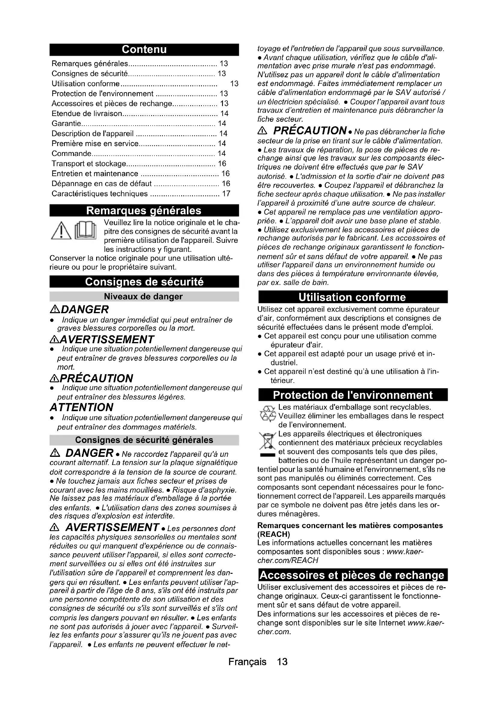 - 30 * 50 Filter efficiency at 0.3 μm 99,95% 99,95% Maximum filter working time (depending on envi- ronment) h 3000 3000 Ventilation levels 5 5 Dimensions and weights Weight kg 5.8 7.7 Length x width x height mm 260x260 x480 290x290 x560 Ambient conditions Ambient temperature °C -10 °C - +40 °C -10 °C - +40 °C Determined values in acc. with EN 60335-2-69 AF 30 AF 50 dB(A) 26-51 29-53 Sound pressure levelFrançais 13 Contenu Remarques générales Veuillez lire la notice originale et le cha- pitre des consignes de sécurité avant la première utilisation de l'appareil. Suivre les instructions y figurant. Conserver la notice originale pour une utilisation ulté- rieure ou pour le propriétaire suivant. Consignes de sécurité Niveaux de danger DANGER ● Indique un danger immédiat qui peut entraîner de graves blessures corporelles ou la mort. 몇 AVERTISSEMENT ● Indique une situation potentiellement dangereuse qui peut entraîner de graves blessures corporelles ou la mort. 몇 PRÉCAUTION ● Indique une situation potentiellement dangereuse qui peut entraîner des blessures légères. ATTENTION ● Indique une situation potentiellement dangereuse qui peut entraîner des dommages matériels. Consignes de sécurité générales DANGER ● Ne raccordez l'appareil qu'à un courant alternatif. La tension sur la plaque signalétique doit correspondre à la tension de la source de courant. ● Ne touchez jamais aux fiches secteur et prises de courant avec les mains mouillées. ● Risque d'asphyxie. Ne laissez pas les matériaux d'emballage à la portée des enfants. ● L'utilisation dans des zones soumises à des risques d'explosion est interdite. 몇 AVERTISSEMENT ● Les personnes dont les capacités physiques sensorielles ou mentales sont réduites ou qui manquent d'expérience ou de connais- sance peuvent utiliser l'appareil, si elles sont correcte- ment surveillées ou si elles ont été instruites sur l'utilisation sûre de l'appareil et comprennent les dan- gers qui en résultent. ● Les enfants peuvent utiliser l'ap- pareil à partir de l'âge de 8 ans, s'ils ont été instruits par une personne compétente de son utilisation et des consignes de sécurité ou s'ils sont surveillés et s'ils ont compris les dangers pouvant en résulter. ● Les enfants ne sont pas autorisés à jouer avec l’appareil. ● Surveil- lez les enfants pour s’assurer qu’ils ne jouent pas avec l’appareil. ● Les enfants ne peuvent effectuer le net- toyage et l'entretien de l'appareil que sous surveillance. ● Avant chaque utilisation, vérifiez que le câble d'ali- mentation avec prise murale n'est pas endommagé. N'utilisez pas un appareil dont le câble d'alimentation est endommagé. Faites immédiatement remplacer un câble d'alimentation endommagé par le SAV autorisé / un électricien spécialisé. ● Couper l’appareil avant tous travaux d’entretien et maintenance puis débrancher la fiche secteur. 몇 PRÉCAUTION ● Ne pas débrancher la fiche secteur de la prise en tirant sur le câble d'alimentation. ● Les travaux de réparation, la pose de pièces de re- change ainsi que les travaux sur les composants élec- triques ne doivent être effectués que par le SAV autorisé. ● L'admission et la sortie d'air ne doivent pas être recouvertes. ● Coupez l'appareil et débranchez la fiche secteur après chaque utilisation. ● Ne pas installer l’appareil à proximité d’une autre source de chaleur. ● Cet appareil ne remplace pas une ventilation appro- priée. ● L’appareil doit avoir une base plane et stable. ● Utilisez exclusivement les accessoires et pièces de rechange autorisés par le fabricant. Les accessoires et pièces de rechange originaux garantissent le fonction- nement sûr et sans défaut de votre appareil. ● Ne pas utiliser l'appareil dans un environnement humide ou dans des pièces à température environnante élevée, par ex. salle de bain. Utilisation conforme Utilisez cet appareil exclusivement comme épurateur d’air, conformément aux descriptions et consignes de sécurité effectuées dans le présent mode d'emploi. ● Cet appareil est conçu pour une utilisation comme épurateur d'air. ● Cet appareil est adapté pour un usage privé et in- dustriel. ● Cet appareil n’est destiné qu’à une utilisation à l'in- térieur. Protection de l'environnement Les matériaux d'emballage sont recyclables. Veuillez éliminer les emballages dans le respect de l’environnement. Les appareils électriques et électroniques contiennent des matériaux précieux recyclables et souvent des composants tels que des piles, batteries ou de l’huile représentant un danger po- tentiel pour la santé humaine et l'environnement, s'ils ne sont pas manipulés ou éliminés correctement. Ces composants sont cependant nécessaires pour le fonc- tionnement correct de l'appareil. Les appareils marqués par ce symbole ne doivent pas être jetés dans les or- dures ménagères. Remarques concernant les matières composantes (REACH) Les informations actuelles concernant les matières composantes sont disponibles sous : www.kaer- cher.com/REACH Accessoires et pièces de rechange Utiliser exclusivement des accessoires et pièces de re- change originaux. Ceux-ci garantissent le fonctionne- ment sûr et sans défaut de votre appareil. Des informations sur les accessoires et pièces de re- change sont disponibles sur le site Internet www.kaer- cher.com. Remarques générales......................................... 13 Consignes de sécurité......................................... 13 Utilisation conforme............................................. 13 Protection de l'environnement ............................. 13 Accessoires et pièces de rechange..................... 13 Etendue de livraison............................................ 14 Garantie............................................................... 14 Description de l'appareil .....................................