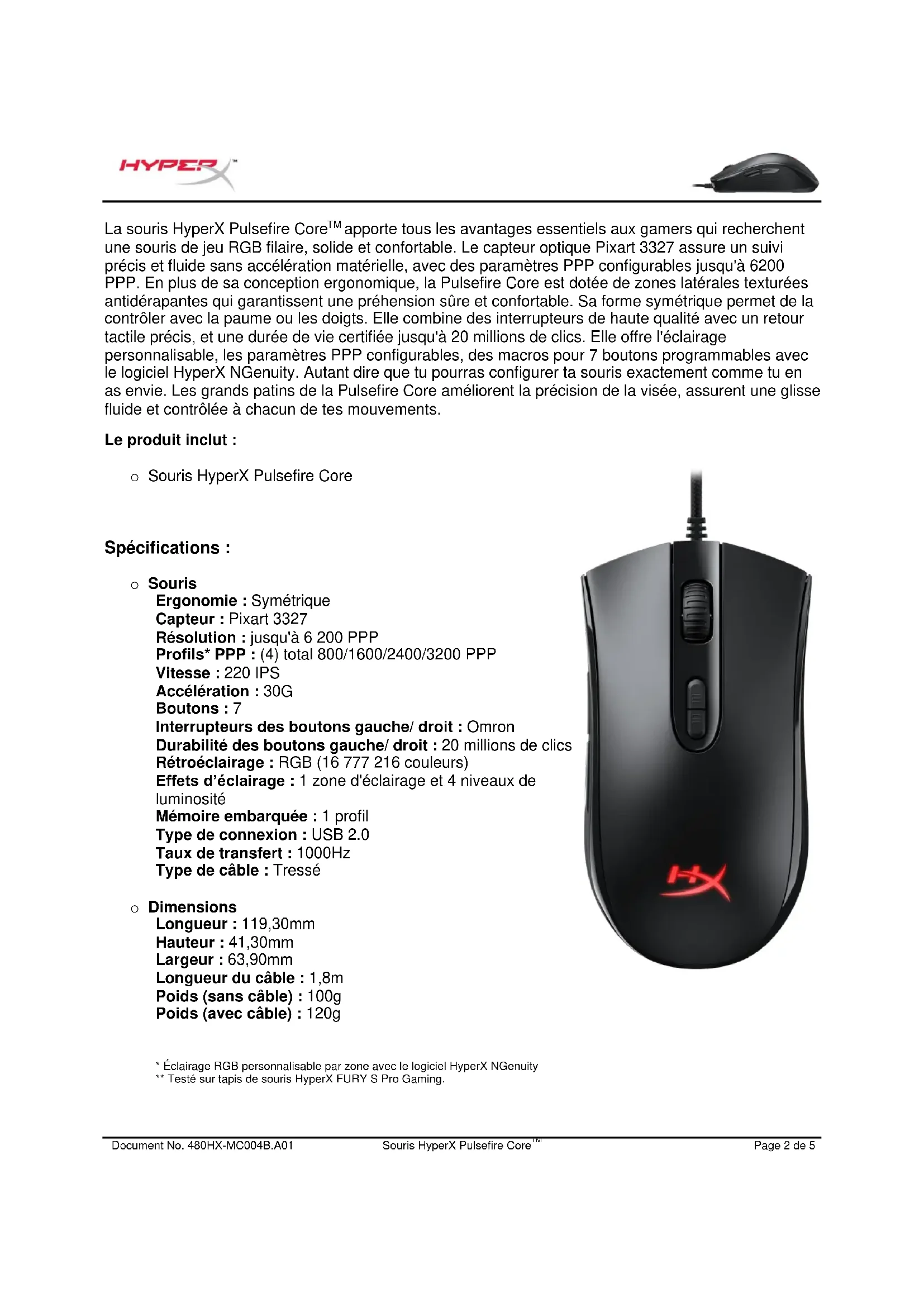 Le produit inclut : o Souris HyperX Pulsefire Core
