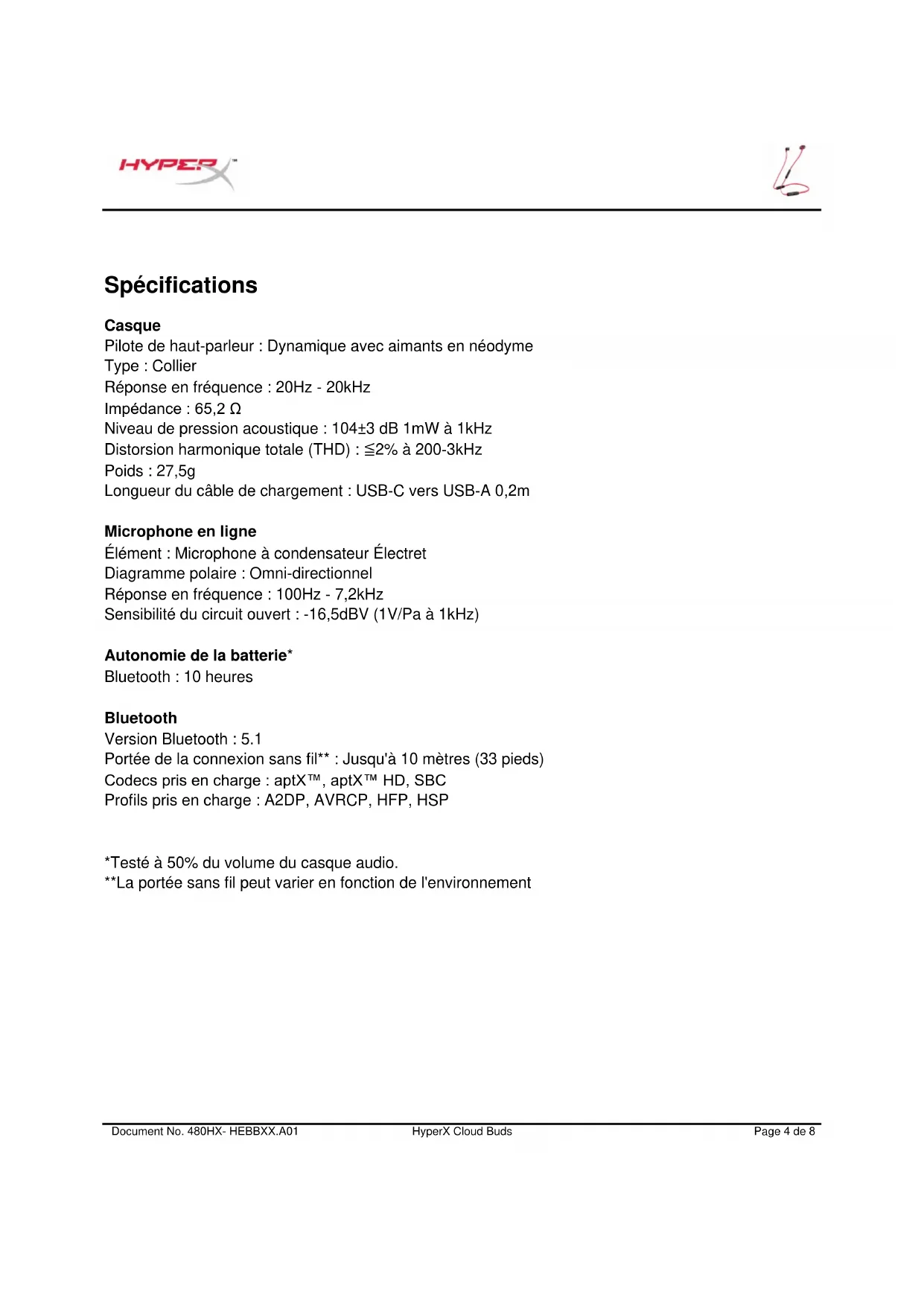 *Testé à 50% du volume du casque audio. **La portée sans fil peut varier en fonction de l'environnementDocument No. 480HX- HEBBXX.A01 HyperX Cloud Buds Page 5 de 8
