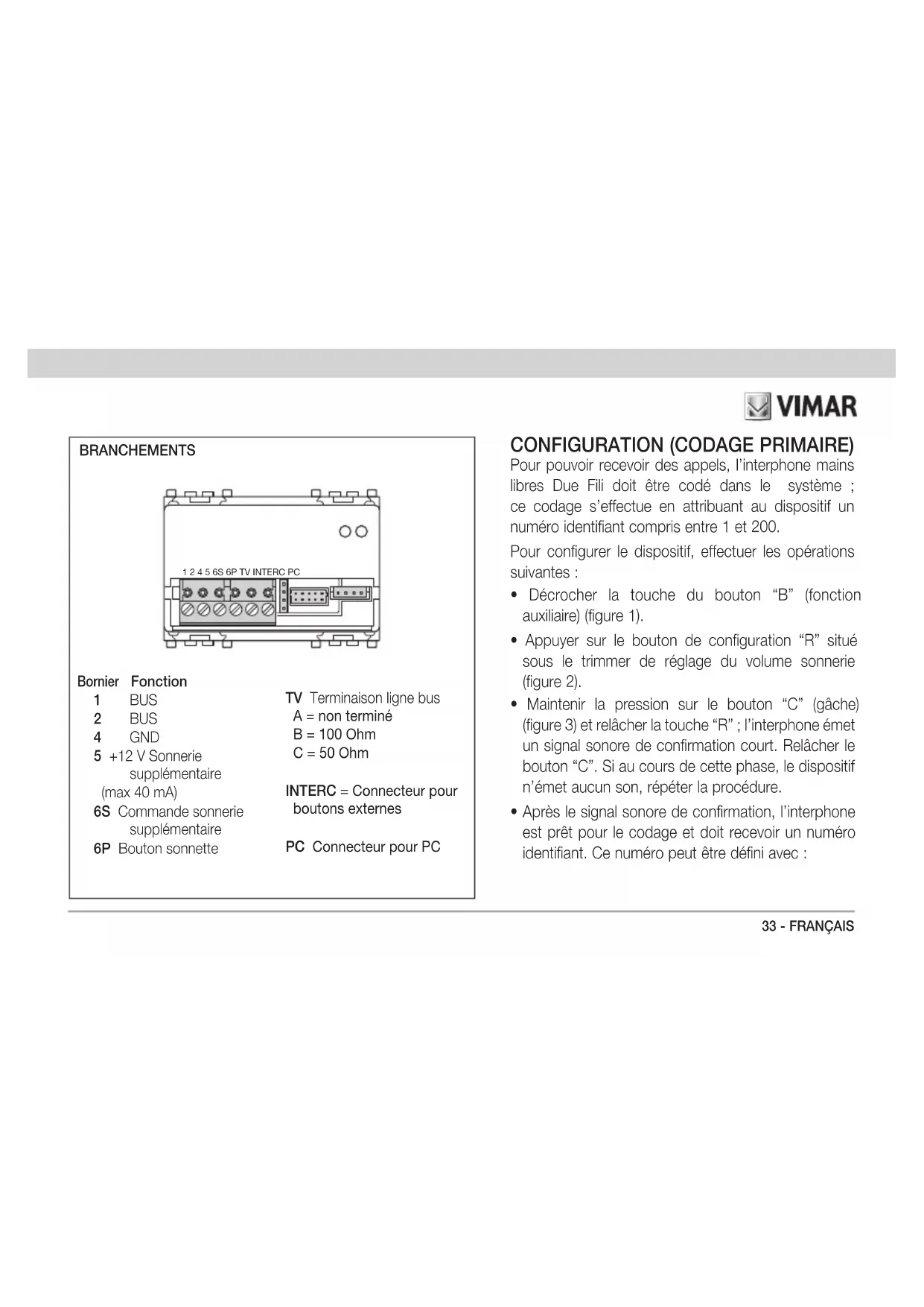 - Après le signal sonore de confirmation, l’interphone est prêt pour le codage et doit recevoir un numéro identifiant. Ce numéro peut être défini avec : Bornier Fonction 1 BUS 2 BUS 4 GND 5 +12 V Sonnerie supplémentaire (max 40 mA) 6S Commande sonnerie supplémentaire 6P Bouton sonnette TV Terminaison ligne bus A = non terminé B = 100 Ohm C = 50 Ohm INTERC = Connecteur pour boutons externes PC Connecteur pour PC BRANCHEMENTS 1 2 4 5 6S 6P TV INTERC PC34 - FRANÇAIS CODAGE SECONDAIRE (appels de groupe) Le même appel peut être envoyé à plusieurs interphones/ portier-vidéo en même temps (“appel de groupe”) : un appel au « chef de groupe » permet de répondre à tous les interphones/portier-vidéo de ce groupe. Le chef de groupe est un interphone/portier-vidéo codé directement et associé à un appel externe venant de la plaque. Pour programmer l’interphone comme poste secondaire d’un chef de groupe, appuyer sur le bouton de codage “R” situé sous le trimmer de réglage du volume sonnerie (figure 2) et maintenir la pression sur les touches gâche “C” et fonction auxiliaire “B” pendant au moins 3 secondes en relâchant la touche “R”, jusqu’à ce que l’interphone émette un son ; relâcher les touches “C” et “B”. Appuyer sur le bouton de la plaque ou composer le numéro correspondant au chef de groupe : automatiquement le poste secondaire prend le code identifiant du chef de groupe. - la plaque et un clavier alphanumérique ou les boutons simples Due Fili - pour envoyer l’appel, taper le code (clavier alphanumérique) ou appuyer sur le bouton associé à l’interphone (plaque à boutons) - - un ordinateur portable, l’interface USB et le logiciel dédié “SaveProg”. Consulter la documentation technique sur les procédures d’envoi du code à l’interphone en fonction de l’instrument de codage utilisé.