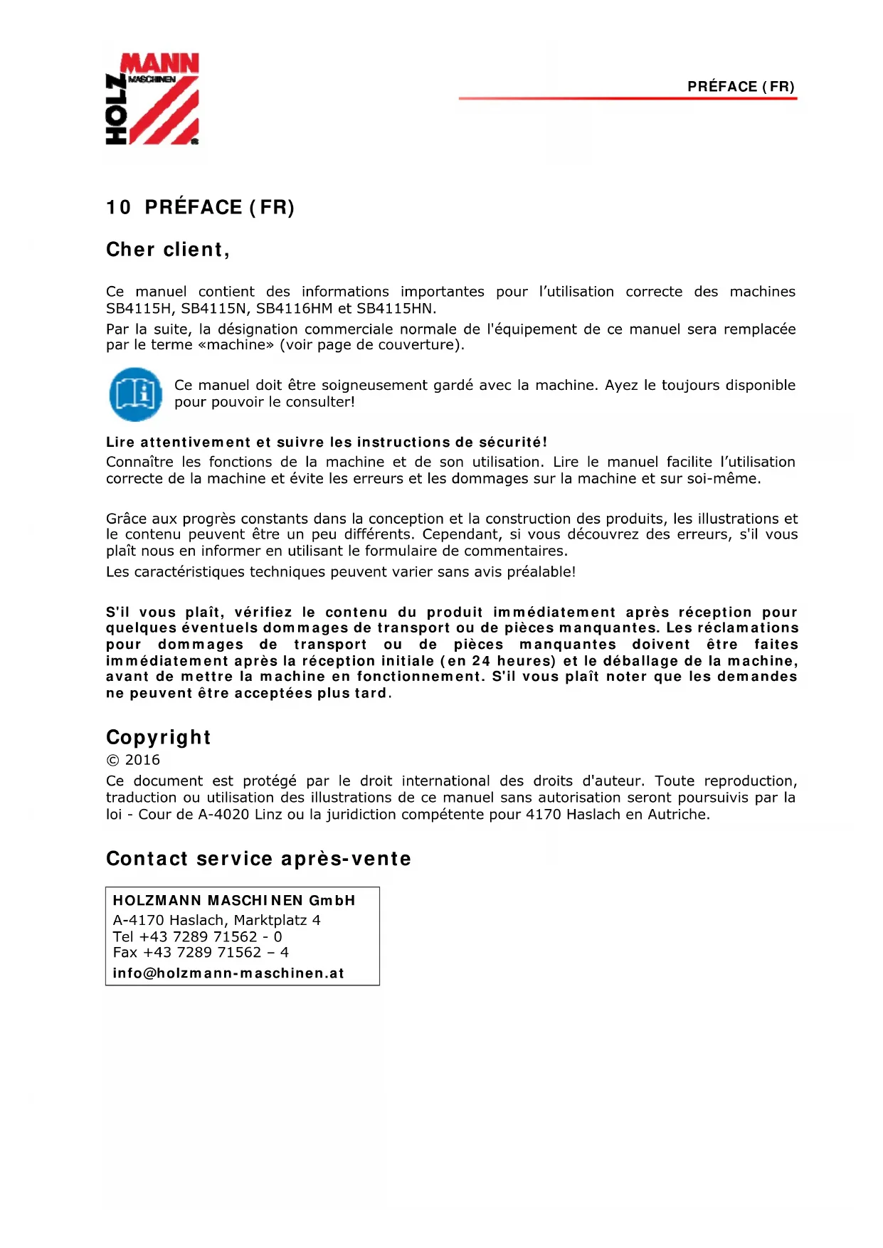 Fehler Mögliche Ursache Behebung Motor läuft nicht Netzanschluss inkorrekt Von Fachmann überprüfen lassen Schalter defekt Austausch Motor defekt Austausch Sicherheitseinrichtungen sind aktiv NOT-AUS-Schalter und Schalter in der Keilriemenabdeckung (offen?) kontrollieren Ungewöhnliches Betriebsgeräusch Falsche Keilriemenspannung Keilriemen auf richtige Spannung einstellen. Drucktest mit Finger (1cm Spiel) Bohrer ist dezentriert/läuft unwucht/“eiert“ Bohrfutter eiert Bohrfutter mit Holz-, Gummihammer festklopfen. Spindel ist ausgeleiert Spindel oder Kugellager austauschen Spannbacken sind defekt Bohrfutter austauschen Bohrer raucht Zu hohe Reibung Bohrer-Werkstoff Verhältnis Geschwindigkeit/Material Schmiermittel verwenden Zu hohe Geschwindigkeit, Reduzieren! Motor läuft, aber keine Rotation bzw. schwache Bohrleistung. Mangelnde Kraftübersetzung von Keilscheiben zu Keilriemen durch: Zu lockere Riemen Riemen verunreinigt mit Schmiermittel Riemen überprüfen, wenn abgenützt: Austausch. Ansonsten Riemen spannen Riemen reinigen, trocknen. VIELE POTENTIELLE FEHLERQUELLEN LASSEN SICH BEI FACHGEMÄSSEM ANSCHLUSS AN DAS SPEISESTROMNETZ IM VORHINEIN AUSSCHLIESSEN.PRÉFACE (FR) 10 PRÉFACE (FR) Cher client, Ce manuel contient des informations importantes pour l’utilisation correcte des machines SB4115H, SB4115N, SB4116HM et SB4115HN. Par la suite, la désignation commerciale normale de l'équipement de ce manuel sera remplacée par le terme «machine» (voir page de couverture). Ce manuel doit être soigneusement gardé avec la machine. Ayez le toujours disponible pour pouvoir le consulter! Lire attentivement et suivre les instructions de sécurité! Connaître les fonctions de la machine et de son utilisation. Lire le manuel facilite l’utilisation correcte de la machine et évite les erreurs et les dommages sur la machine et sur soi-même. Grâce aux progrès constants dans la conception et la construction des produits, les illustrations et le contenu peuvent être un peu différents. Cependant, si vous découvrez des erreurs, s'il vous plaît nous en informer en utilisant le formulaire de commentaires. Les caractéristiques techniques peuvent varier sans avis préalable! S'il vous plaît, vérifiez le contenu du produit immédiatement après réception pour quelques éventuels dommages de transport ou de pièces manquantes. Les réclamations pour dommages de transport ou de pièces manquantes doivent être faites immédiatement après la réception initiale (en 24 heures) et le déballage de la machine, avant de mettre la machine en fonctionnement. S'il vous plaît noter que les demandes ne peuvent être acceptées plus tard. Copyright © 2016 Ce document est protégé par le droit international des droits d'auteur. Toute reproduction, traduction ou utilisation des illustrations de ce manuel sans autorisation seront poursuivis par la loi - Cour de A-4020 Linz ou la juridiction compétente pour 4170 Haslach en Autriche. Contact service après-vente