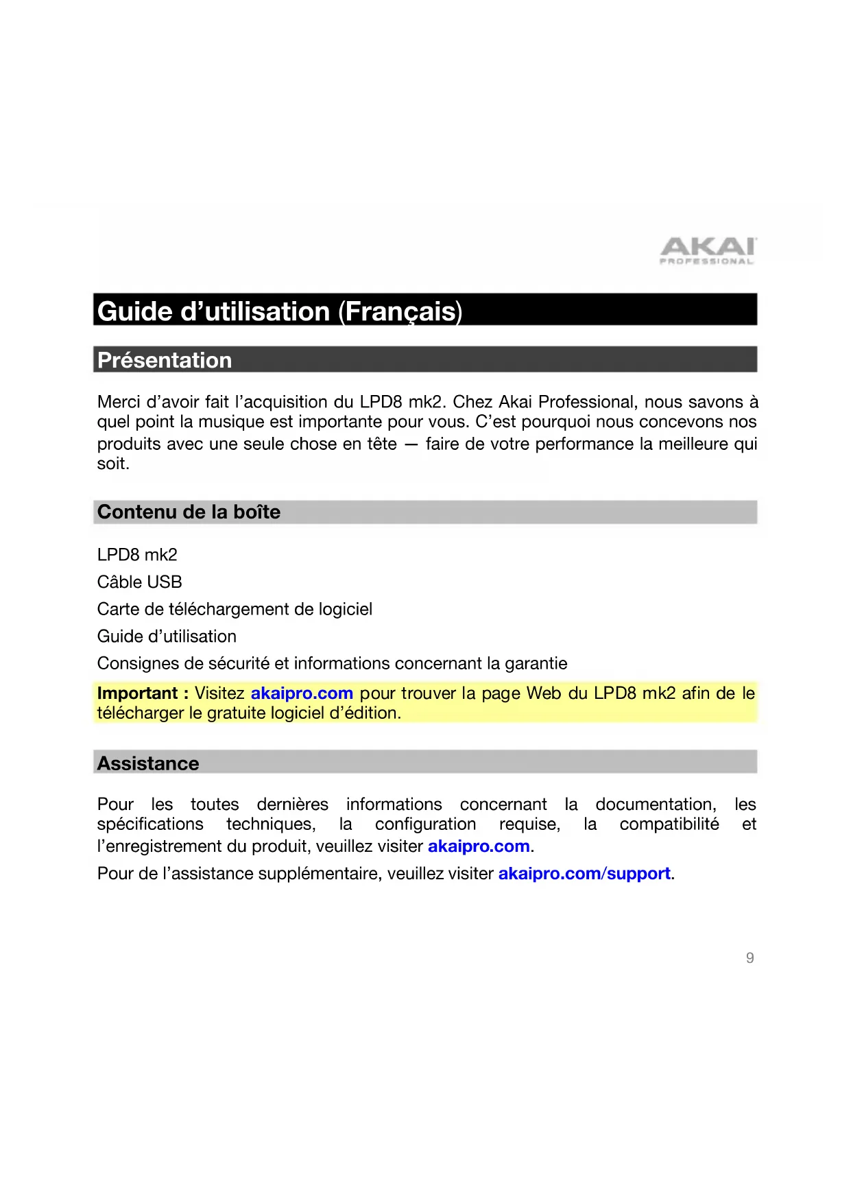 - todas las asignaciones de perillas (números y rangos de CC MIDI) Para seleccionar un programa, mantenga pulsado Program y pulse uno de los Pads 1–4 (Prog 1–4). Para administrar sus programas, use el software de edición del LPD8 mk2. Visite akaipro.com y entre a la página web del LPD8 mk2 para descargarlo.9 Guide d’utilisation (Français) Présentation Merci d’avoir fait l’acquisition du LPD8 mk2. Chez Akai Professional, nous savons à quel point la musique est importante pour vous. C’est pourquoi nous concevons nos produits avec une seule chose en tête — faire de votre performance la meilleure qui soit. Contenu de la boîte LPD8 mk2 Câble USB Carte de téléchargement de logiciel Guide d’utilisation Consignes de sécurité et informations concernant la garantie Important : Visitez akaipro.com pour trouver la page Web du LPD8 mk2 afin de le télécharger le gratuite logiciel d’édition. Assistance Pour les toutes dernières informations concernant la documentation, les spécifications techniques, la configuration requise, la compatibilité et l’enregistrement du produit, veuillez visiter akaipro.com. Pour de l’assistance supplémentaire, veuillez visiter akaipro.com/support.10 Caractéristiques