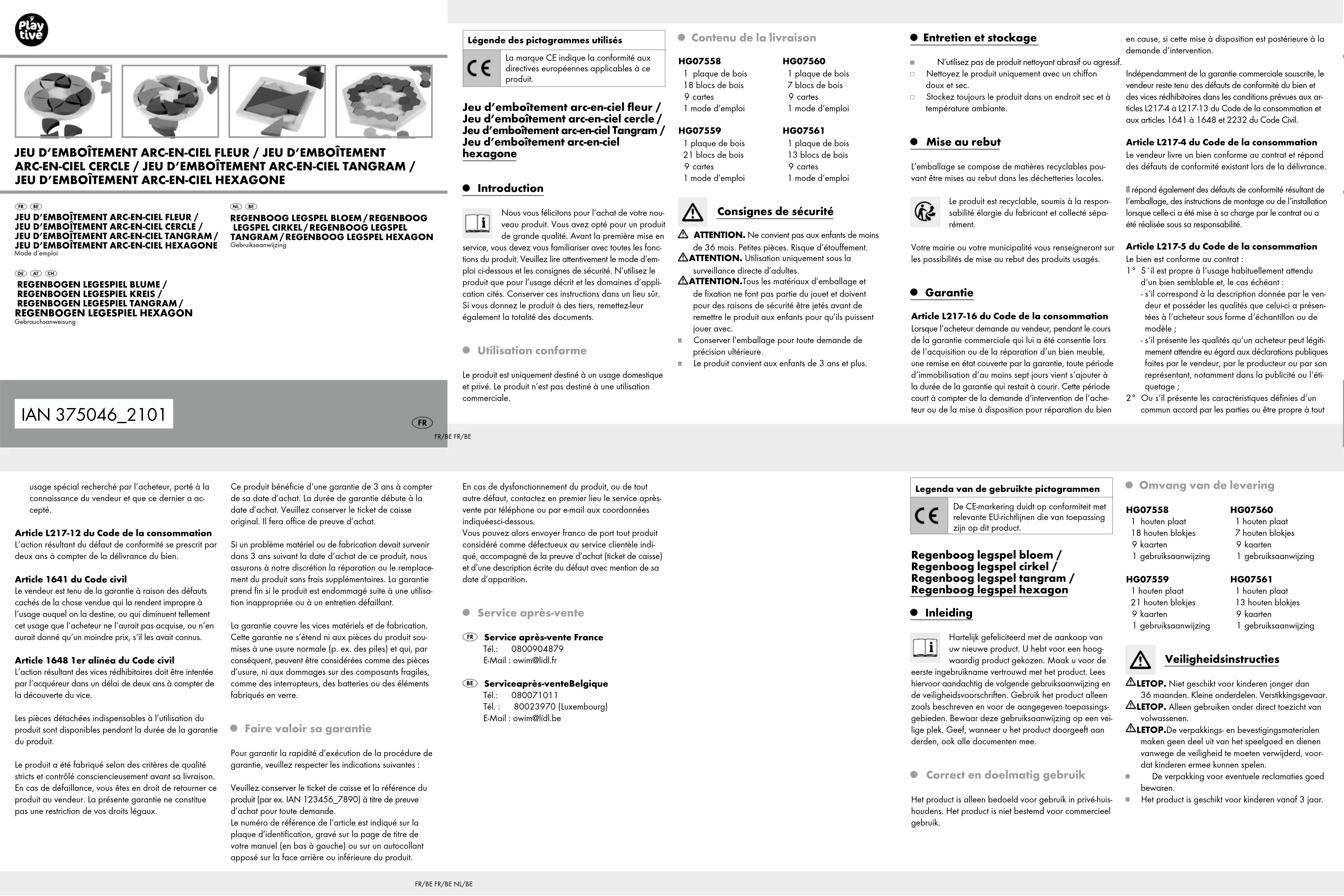 FR/BE FR/BE FR/BEFR/BE FR/BE NL/BE Legenda van de gebruikte pictogrammen De CE-markering duidt op conformiteit met relevante EU-richtlijnen die van toepassing zijn op dit product. Regenboog legspel bloem / Regenboog legspel cirkel / Regenboog legspel tangram / Regenboog legspel hexagon Inleiding Hartelijk gefeliciteerd met de aankoop van uw nieuwe product. U hebt voor een hoog- waardig product gekozen. Maak u voor de eerste ingebruikname vertrouwd met het product. Lees hiervoor aandachtig de volgende gebruiksaanwijzing en de veiligheidsvoorschriften. Gebruik het product alleen zoals beschreven en voor de aangegeven toepassings- gebieden. Bewaar deze gebruiksaanwijzing op een vei- lige plek. Geef, wanneer u het product doorgeeft aan derden, ook alle documenten mee. Correct en doelmatig gebruik Het product is alleen bedoeld voor gebruik in privé-huis- houdens. Het product is niet bestemd voor commercieel gebruik. Omvang van de levering HG07558 1 houten plaat 18 houten blokjes 9 kaarten 1 gebruiksaanwijzing HG07559 1 houten plaat 21 houten blokjes 9 kaarten 1 gebruiksaanwijzing HG07560 1 houten plaat 7 houten blokjes 9 kaarten 1 gebruiksaanwijzing HG07561 1 houten plaat 13 houten blokjes 9 kaarten 1 gebruiksaanwijzing Veiligheidsinstructies LET OP. Niet geschikt voor kinderen jonger dan 36 maanden. Kleine onderdelen. Verstikkingsgevaar. LET OP. Alleen gebruiken onder direct toezicht van volwassenen. LET OP. De verpakkings- en bevestigingsmaterialen maken geen deel uit van het speelgoed en dienen vanwege de veiligheid te moeten verwijderd, voor- dat kinderen ermee kunnen spelen. De verpakking voor eventuele reclamaties goed bewaren. Het product is geschikt voor kinderen vanaf 3 jaar. En cas de dysfonctionnement du produit, ou de tout autre défaut, contactez en premier lieu le service après- vente par téléphone ou par e-mail aux coordonnées indiquées ci-dessous. Vous pouvez alors envoyer franco de port tout produit considéré comme défectueux au service clientèle indi- qué, accompagné de la preuve d’achat (ticket de caisse) et d’une description écrite du défaut avec mention de sa date d’apparition. Service après-vente Service après-vente France Tél. : 0800904879 E-Mail : owim@lidl.fr Service après-vente Belgique Tél. : 080071011 Tél. : 80023970 (Luxembourg) E-Mail : owim@lidl.be usage spécial recherché par l‘acheteur, porté à la connaissance du vendeur et que ce dernier a ac- cepté. Article L217-12 du Code de la consommation L‘action résultant du défaut de conformité se prescrit par deux ans à compter de la délivrance du bien. Article 1641 du Code civil Le vendeur est tenu de la garantie à raison des défauts cachés de la chose vendue qui la rendent impropre à l‘usage auquel on la destine, ou qui diminuent tellement cet usage que l‘acheteur ne l‘aurait pas acquise, ou n‘en aurait donné qu‘un moindre prix, s‘il les avait connus. Article 1648 1er alinéa du Code civil L‘action résultant des vices rédhibitoires doit être intentée par l‘acquéreur dans un délai de deux ans à compter de la découverte du vice. Les pièces détachées indispensables à l’utilisation du produit sont disponibles pendant la durée de la garantie du produit. Le produit a été fabriqué selon des critères de qualité stricts et contrôlé consciencieusement avant sa livraison. En cas de défaillance, vous êtes en droit de retourner ce produit au vendeur. La présente garantie ne constitue pas une restriction de vos droits légaux. Ce produit bénéficie d‘une garantie de 3 ans à compter de sa date d’achat. La durée de garantie débute à la date d’achat. Veuillez conserver le ticket de caisse original. Il fera office de preuve d’achat. Si un problème matériel ou de fabrication devait survenir dans 3 ans suivant la date d‘achat de ce produit, nous assurons à notre discrétion la réparation ou le remplace- ment du produit sans frais supplémentaires. La garantie prend fin si le produit est endommagé suite à une utilisa- tion inappropriée ou à un entretien défaillant. La garantie couvre les vices matériels et de fabrication. Cette garantie ne s’étend ni aux pièces du produit sou- mises à une usure normale (p. ex. des piles) et qui, par conséquent, peuvent être considérées comme des pièces d’usure, ni aux dommages sur des composants fragiles, comme des interrupteurs, des batteries ou des éléments fabriqués en verre. Faire valoir sa garantie Pour garantir la rapidité d’exécution de la procédure de garantie, veuillez respecter les indications suivantes : Veuillez conserver le ticket de caisse et la référence du produit (par ex. IAN 123456_7890) à titre de preuve d’achat pour toute demande. Le numéro de référence de l’article est indiqué sur la plaque d’identification, gravé sur la page de titre de votre manuel (en bas à gauche) ou sur un autocollant apposé sur la face arrière ou inférieure du produit. Entretien et stockage N’utilisez pas de produit nettoyant abrasif ou agressif. Nettoyez le produit uniquement avec un chiffon doux et sec. Stockez toujours le produit dans un endroit sec et à température ambiante. Mise au rebut L’emballage se compose de matières recyclables pou- vant être mises au rebut dans les déchetteries locales. Le produit est recyclable, soumis à la respon- sabilité élargie du fabricant et collecté sépa- rément. Votre mairie ou votre municipalité vous renseigneront sur les possibilités de mise au rebut des produits usagés. Garantie Article L217-16 du Code de la consommation Lorsque l‘acheteur demande au vendeur, pendant le cours de la garantie commerciale qui lui a été consentie lors de l‘acquisition ou de la réparation d‘un bien meuble, une remise en état couverte par la garantie, toute période d‘immobilisation d‘au moins sept jours vient s‘ajouter à la durée de la garantie qui restait à courir. Cette période court à compter de la demand