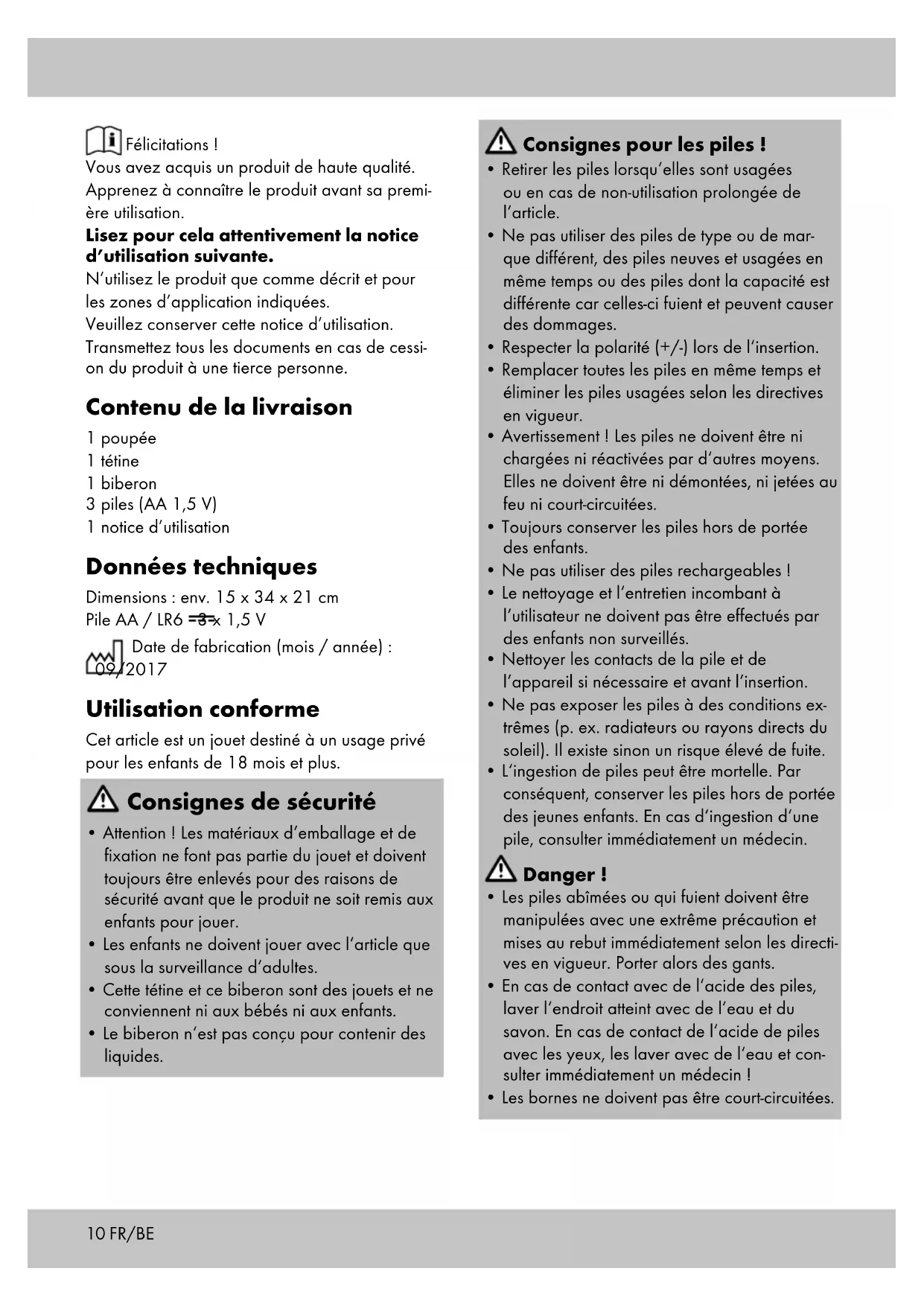 - s‘il présente les qualités qu‘un acheteur peut légitimement attendre eu égard aux déclara- tions publiques faites par le vendeur, par le producteur ou par son représentant, notam- ment dans la publicité ou l‘étiquetage ;13FR/BE 2° Ou s‘il présente les caractéristiques définies d‘un commun accord par les parties ou être propre à tout usage spécial recherché par l‘acheteur, porté à la connaissance du vendeur et que ce dernier a accepté. Article L217-12 du Code de la consommation L‘action résultant du défaut de conformité se prescrit par deux ans à compter de la délivrance du bien. Article 1641 du Code civil Le vendeur est tenu de la garantie à raison des défauts cachés de la chose vendue qui la ren- dent impropre à l‘usage auquel on la destine, ou qui diminuent tellement cet usage que l‘acheteur ne l‘aurait pas acquise, ou n‘en aurait donné qu‘un moindre prix, s‘il les avait connus. Article 1648 1er alinéa du Code civil L‘action résultant des vices rédhibitoires doit être intentée par l‘acquéreur dans un délai de deux ans à compter de la découverte du vice. Les pièces détachées indispensables à l’utilisation du produit sont disponibles pendant la durée de la garantie du produit. IAN : 290753 Service France Tel. : 0800 919270 E-Mail : deltasport@lidl.fr Service Belgique Tel. : 070 270 171 (0,15 EUR/Min.) E-Mail : deltasport@lidl.be14 Hartelijk gefeliciteerd! Met de aankoop hebt u gekozen voor een hoogwaardig product. Maak u daarom voor de eerste ingebruikname vertrouwd met het product. Lees hiervoor deze gebruiksaanwijzing aandachtig door. Gebruik het product alleen zoals beschreven en uitsluitend voor de aangegeven doeleinden. Bewaar de handleiding zorgvuldig. Als u het product aan derden geeft, dient u ook deze documenten te overhandigen. In het leveringspakket inbe- grepen 1 x pop 1 x fopspeen 1 x drinkfles 3 x batterij (1,5 V/type AA) 1 x gebruiksaanwijzing Technische gegevens Afmetingen: ca. 15 x 34 x 21 cm 3 x 1,5 V batterijtype AA/LR6 Productiedatum (maand/jaar): 09/2017 Voorgeschreven gebruik Bij dit artikel gaat het om speelgoed voor kin- deren met een leeftijd vanaf 18 maanden voor privégebruik. Veiligheidsadviezen