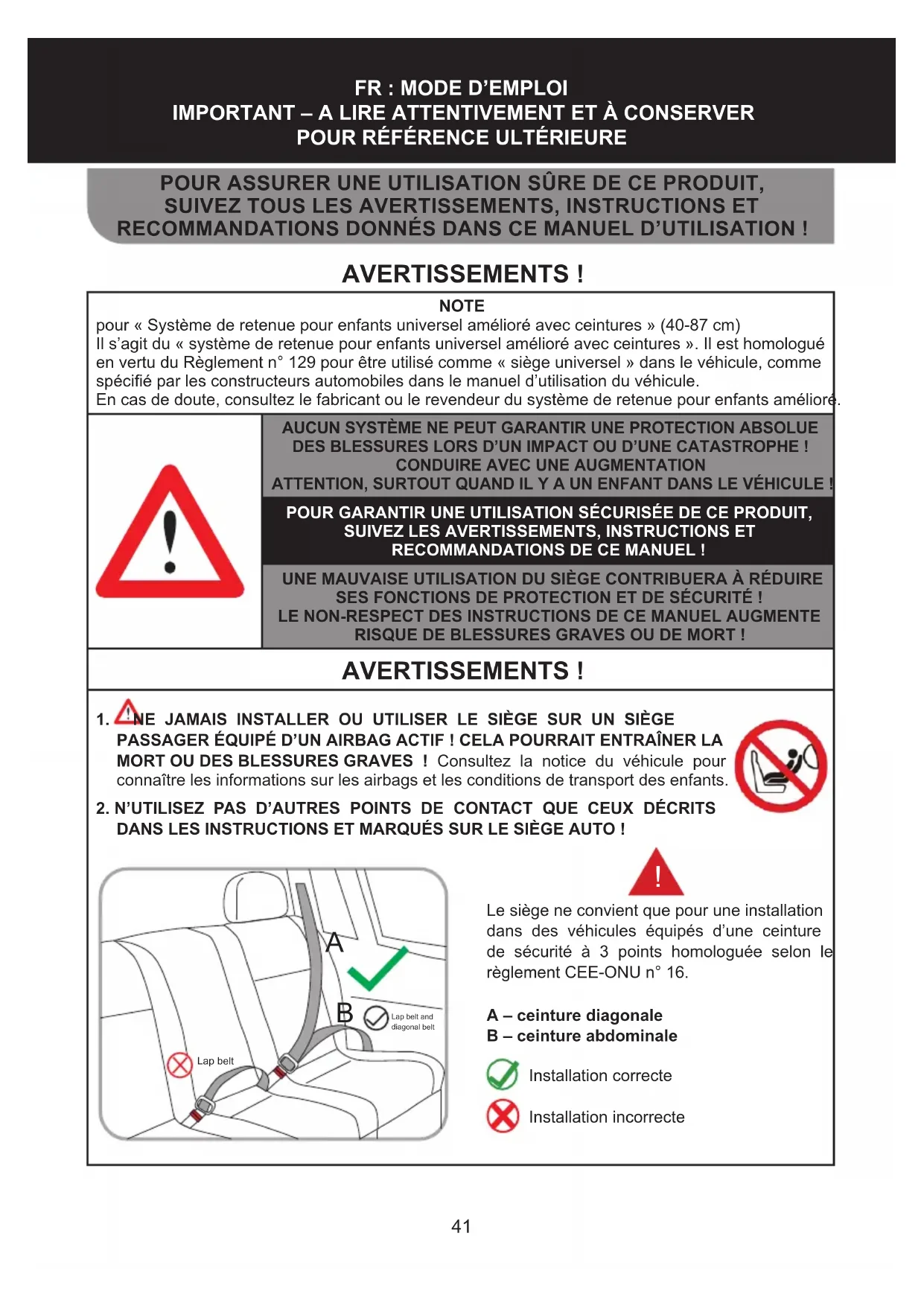 AVERTISSEMENTS ! NOTE pour « Système de retenue pour enfants universel amélioré avec ceintures » (40-87 cm)Il s’agit du « système de retenue pour enfants universel amélioré avec ceintures ». Il est homologué en vertu du Règlement n° 129 pour être utilisé comme « siège universel » dans le véhicule, comme spécié par les constructeurs automobiles dans le manuel d’utilisation du véhicule.En cas de doute, consultez le fabricant ou le revendeur du système de retenue pour enfants amélioré.AUCUN SYSTÈME NE PEUT GARANTIR UNE PROTECTION ABSOLUEDES BLESSURES LORS D’UN IMPACT OU D’UNE CATASTROPHE ! CONDUIRE AVEC UNE AUGMENTATIONATTENTION, SURTOUT QUAND IL Y A UN ENFANT DANS LE VÉHICULE !POUR GARANTIR UNE UTILISATION SÉCURISÉE DE CE PRODUIT,SUIVEZ LES AVERTISSEMENTS, INSTRUCTIONS ET RECOMMANDATIONS DE CE MANUEL !UNE MAUVAISE UTILISATION DU SIÈGE CONTRIBUERA À RÉDUIRE SES FONCTIONS DE PROTECTION ET DE SÉCURITÉ !LE NON-RESPECT DES INSTRUCTIONS DE CE MANUEL AUGMENTERISQUE DE BLESSURES GRAVES OU DE MORT ! AVERTISSEMENTS ! 1. NE JAMAIS INSTALLER OU UTILISER LE SIÈGE SUR UN SIÈGE PASSAGER ÉQUIPÉ D’UN AIRBAG ACTIF ! CELA POURRAIT ENTRAÎNER LA MORT OU DES BLESSURES GRAVES ! Consultez la notice du véhicule pour connaître les informations sur les airbags et les conditions de transport des enfants.