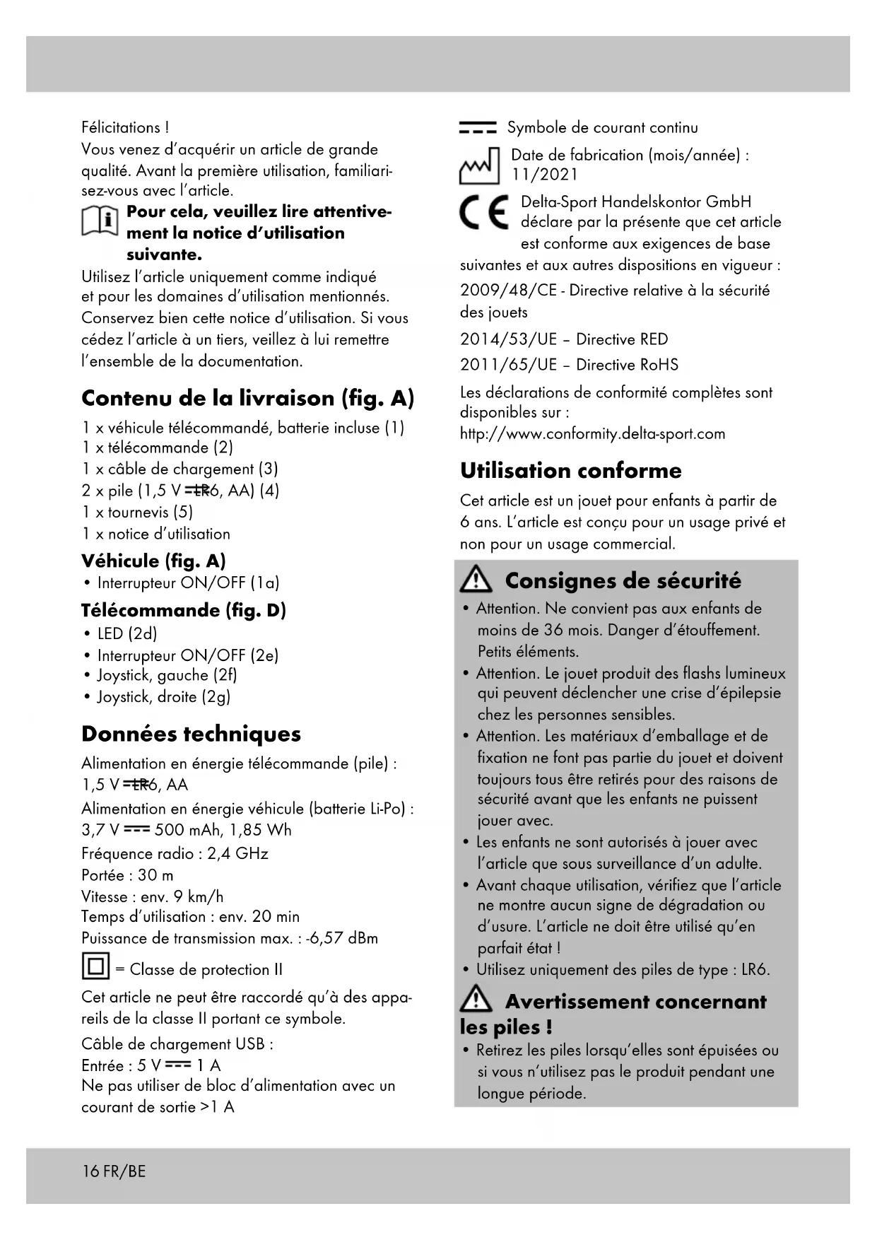 - Joystick, droite (2g) Données techniques Alimentation en énergie télécommande (pile) : 1,5 V LR6, AA Alimentation en énergie véhicule (batterie Li-Po) : 3,7 V 500 mAh, 1,85 Wh Fréquence radio : 2,4 GHz Portée : 30 m Vitesse : env. 9 km/h Temps d’utilisation : env. 20 min Puissance de transmission max. : -6,57 dBm = Classe de protection II Cet article ne peut être raccordé qu’à des appa- reils de la classe II portant ce symbole. Câble de chargement USB : Entrée : 5 V 1 A Ne pas utiliser de bloc d’alimentation avec un courant de sortie >1 A Symbole de courant continu Date de fabrication (mois/année) : 11/2021 Delta-Sport Handelskontor GmbH déclare par la présente que cet article est conforme aux exigences de base suivantes et aux autres dispositions en vigueur : 2009/48/CE - Directive relative à la sécurité des jouets 2014/53/UE – Directive RED 2011/65/UE – Directive RoHS Les déclarations de conformité complètes sont disponibles sur : http://www.conformity.delta-sport.com Utilisation conforme Cet article est un jouet pour enfants à partir de 6 ans. L’article est conçu pour un usage privé et non pour un usage commercial. Consignes de sécurité