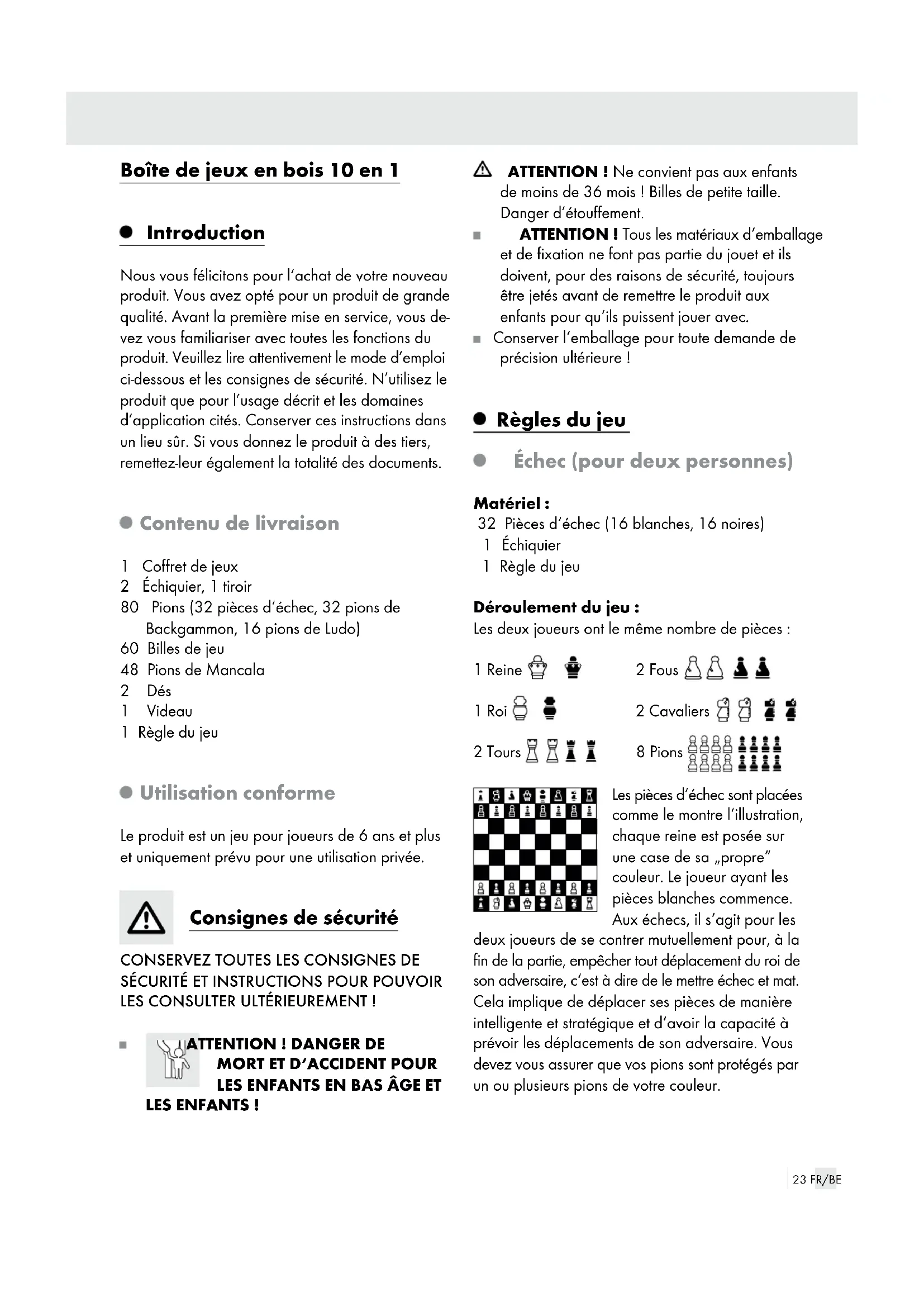 LES ENFANTS ! ATTENTION ! Ne convient pas aux enfants de moins de 36 mois ! Billes de petite taille. Danger d’étouffement. ATTENTION ! Tous les matériaux d‘emballage et de fixation ne font pas partie du jouet et ils doivent, pour des raisons de sécurité, toujours être jetés avant de remettre le produit aux enfants pour qu‘ils puissent jouer avec. Conserver l‘emballage pour toute demande de précision ultérieure ! Règles du jeu Échec (pour deux personnes) Matériel: 32 Pièces d‘échec (16 blanches, 16 noires) 1 Échiquier 1 Règle du jeu Déroulement du jeu : Les deux joueurs ont le même nombre de pièces : 1 Reine 2 Fous 1 Roi 2 Cavaliers 2 Tours 8 Pions Les pièces d‘échec sont placées comme le montre l‘illustration, chaque reine est posée sur une case de sa „propre“ couleur. Le joueur ayant les pièces blanches commence. Aux échecs, il s‘agit pour les deux joueurs de se contrer mutuellement pour, à la fin de la partie, empêcher tout déplacement du roi de son adversaire, c‘est à dire de le mettre échec et mat. Cela implique de déplacer ses pièces de manière intelligente et stratégique et d‘avoir la capacité à prévoir les déplacements de son adversaire. Vous devez vous assurer que vos pions sont protégés par un ou plusieurs pions de votre couleur.24 FR/BE Déplacements des pièces d‘échec : Reine La reine peut être déplacée sur un nombre quelconque de cases et dans toutes les directions, c‘est à dire diago- nalement, verticalement et horizontalement. Roi Le roi peut être déplacé dans toutes les directions (diagona- lement, verticalement et hori- zontalement), mais seulement une case à la fois. Il ne doit pas être pris en considération comme chaque autre pièce lorsqu‘il est menacé. Lorsque le roi est menacé, on doit prévenir en disant „échec“. Tour La tour peut être déplacée sur un nombre quelconque de cases verticalement ou ho- rizontalement. Les pièces de l‘adversaire ne peuvent être attaquées et prises que sur cette ligne. Fou Le fou peut être déplacé sur un nombre quelconque de cases mais uniquement dia- gonalement. Comme les fous ne peuvent jamais changer de couleur de case, ils ne peuvent être attaqués, voire pris, que sur leur couleur de case. Cavalier Le cavalier est la seule pièce avec laquelle on peut sauter au-dessus d‘une autre pièce. C‘est une pièce particulière- ment maniable. Le cavalier se déplace de la manière suivante : une case verticale puis deux cases horizontales ou inversement. Cela signifie que les déplacements avec un cavalier se terminent toujours sur une couleur de case différente. Pions Les pions peuvent être dépla- cés vers l’avant d’une ou de deux cases – ils ne sont dé- placés de deux cases qu’en quittant leur position de dé- part. Dès que les pions ont quitté leur position de départ, ils ne peuvent être déplacés que d‘une case à la fois. Les pions ne peuvent pas être déplacés vers l‘arrière ni attaquer ou prendre une autre pièce de cette même manière. Avec les pions, des pièces ad- verses ne peuvent être prises que diagonalement. Si vous réussissez à amener un pion sur la ligne de départ de votre adversaire, vous pouvez l‘échanger contre une autre pièce que vous avez perdue dans un déplacement précédent, que des pièces identiques se trouvent déjà sur l‘échiquier ou non. Prendre : Lorsqu‘une pièce d‘échec est prise, la pièce réali- sant l‘attaque prend sa place sur l‘échiquier. Le dé- placement „en passant“ ne peut être fait que si un pion est déplacé à partir de sa position de départ.25 FR/BE Lorsqu‘on déplace un pion de deux cases à partir de sa position de départ et qu‘il se retrouve à côté d‘un pion adverse via une case menacée, le pion adverse peut le prendre au prochain déplacement en revenant sur la case menacée. Cela signifie qu‘on place le pion adverse sur la case qu‘il a menacée et que le pion pris est retiré de l‘échiquier. Les dé- placements „en passant“ ne sont pas obligatoires. Roque : C‘est un coup double où le roi et la tour sont déplacés simultanément. Ce coup est utilisé pour placer le roi dans une position particulièrement protégée. Le roque n‘est possible, – que si ni le roi ni la tour n‘ont pas été déplacés le coup d‘avant, – que si aucune autre pièce ne se trouve entre le roi et la tour, – que si le roi n‘est pas échec, – que si ce coup ne met pas le roi en danger (échec). Échec et mat : Lorsque le roi est menacé par une pièce adverse, il se trouve en échec. Ce terme doit être prononcé par le joueur attaquant. L‘autre joueur doit alors libérer son roi de cette position. Il existe pour cela plusieurs possibilités : la pièce menaçante peut être prise, le roi peut se déplacer vers une case vide sur laquelle il n‘est pas menacé ou un des fous du roi peut être déplacé sur la ligne d‘attaque pour défendre le roi. Échec et mat signifie que le roi adverse ne peut plus être sauvé par les déplacements nommés ci-dessus de la position échec et qu‘il sera pris au prochain coup. Match nul : Des situations peuvent se produire à la fin où aucun des joueurs ne peut mettre son adversaire échec et mat. Ce jeu se termine par un match nul. Les deux joueurs doivent être d‘accord avec le match nul. Backgammon (pour deux personnes) Matériel: 30 Pions de Backgammon (15 blancs, 15 noirs) 2 Dés 1 Dé double 1 Plateau 1 Règle du jeu Préparation du jeu : Le plateau est placé entre les deux joueurs de manière à ce que chaque joueur soit assis devant un champ de flèches avec 12 triangle pointus (les dits POINTS). La zone de jeu est partagée en 4 champs auxquels correspondent les cou- leurs blanc et noir. Le jan intérieur noir (dit home-board) se situe en haut à droite, le jan extérieur noir (dit outer-board) se situe en haut à gauche, le jan intérieur blanc se situe en bas à droit