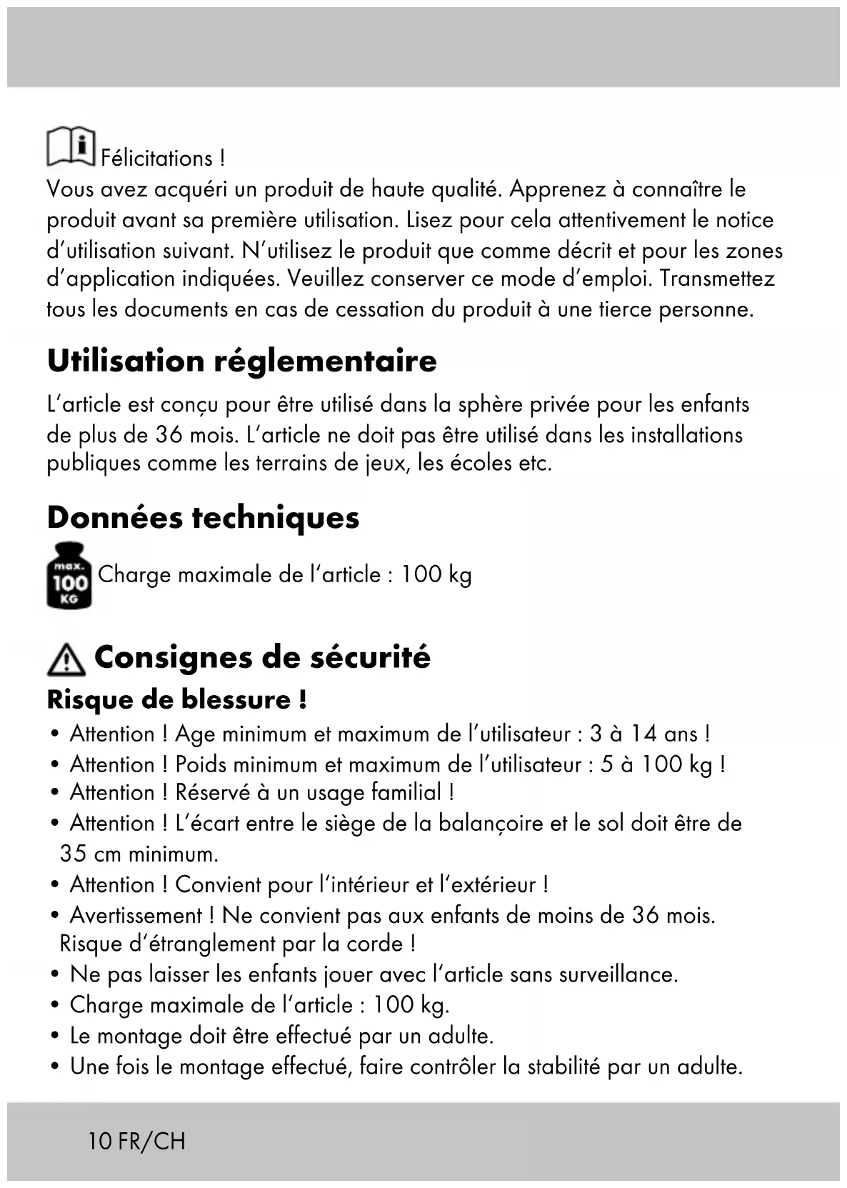 - Veiller à ce qu‘aucun objet anguleux ou dur ne se trouve dans l‘environnement de la balançoire.