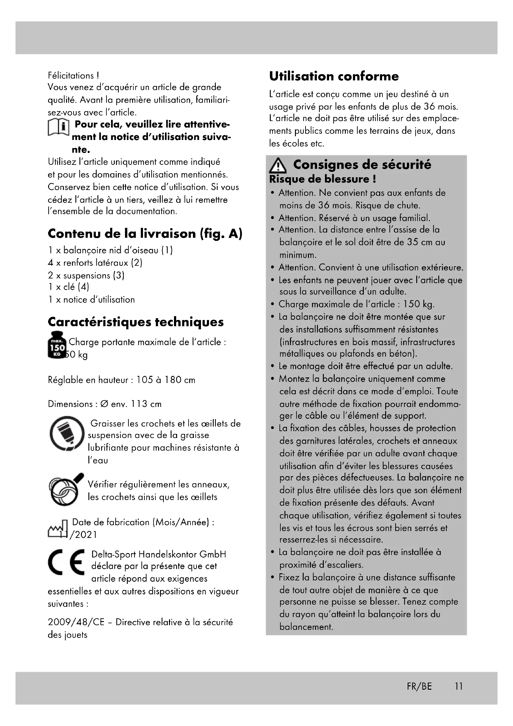 - Fixez la balançoire à une distance suffisante de tout autre objet de manière à ce que personne ne puisse se blesser. Tenez compte du rayon qu‘atteint la balançoire lors du balancement. Félicitations ! Vous venez d’acquérir un article de grande qualité. Avant la première utilisation, familiari- sez-vous avec l’article. Pour cela, veuillez lire attentive- ment la notice d’utilisation suiva- nte. Utilisez l’article uniquement comme indiqué et pour les domaines d’utilisation mentionnés. Conservez bien cette notice d’utilisation. Si vous cédez l’article à un tiers, veillez à lui remettre l’ensemble de la documentation. Contenu de la livraison (fig. A) 1 x balançoire nid d’oiseau (1) 4 x renforts latéraux (2) 2 x suspensions (3) 1 x clé (4) 1 x notice d‘utilisation Caractéristiques techniques Charge portante maximale de l‘article : 150 kg Réglable en hauteur : 105 à 180 cm Dimensions : Ø env. 113 cm Graisser les crochets et les œillets de suspension avec de la graisse lubrifiante pour machines résistante à l’eau Vérifier régulièrement les anneaux, les crochets ainsi que les œillets Date de fabrication (Mois/Année) : 11/2021 Delta-Sport Handelskontor GmbH déclare par la présente que cet article répond aux exigences essentielles et aux autres dispositions en vigueur suivantes : 2009/48/CE – Directive relative à la sécurité des jouets FR/BE12 FR/BE