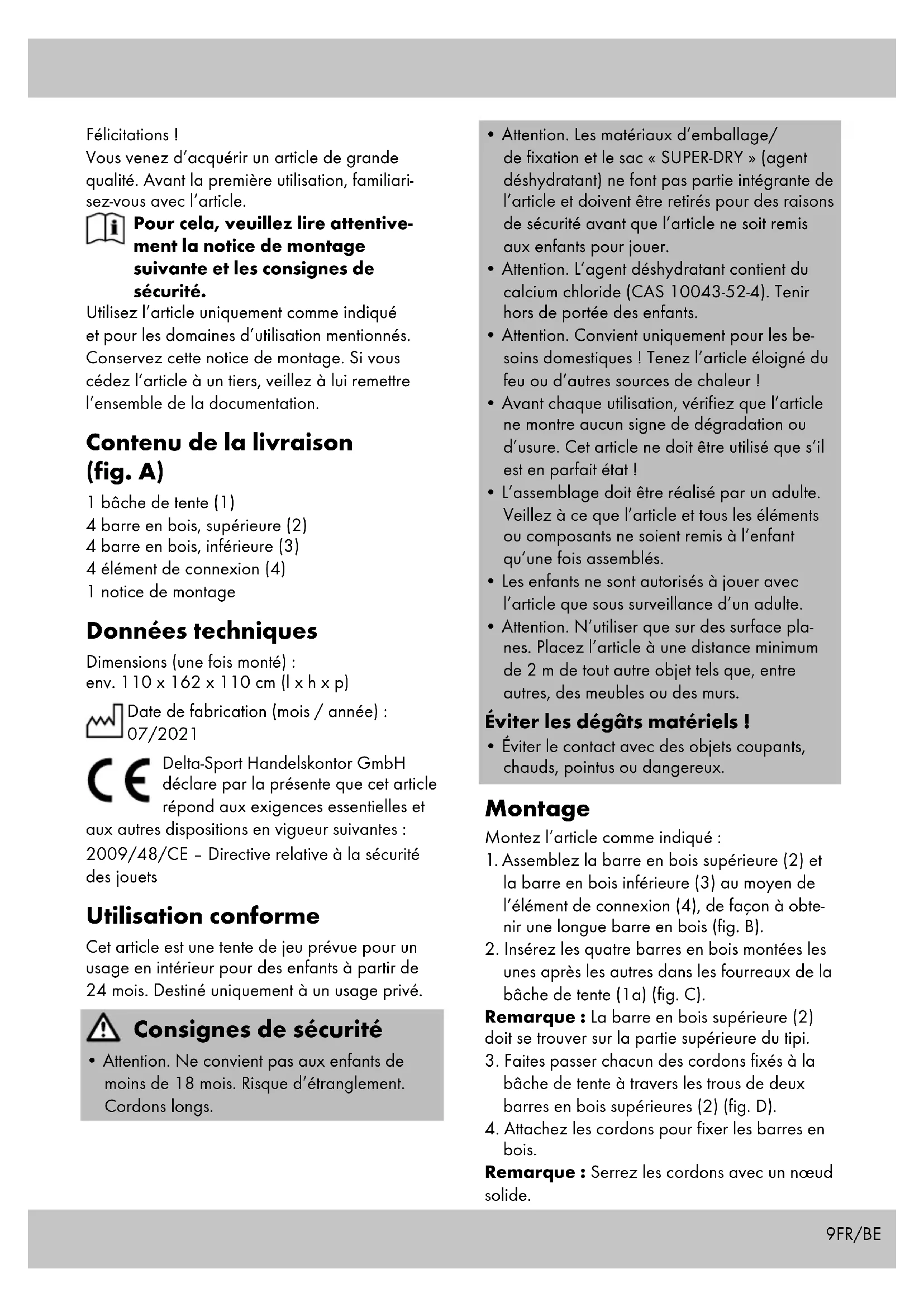 - s‘il présente les qualités qu‘un acheteur peut légitimement attendre eu égard aux déclara- tions publiques faites par le vendeur, par le producteur ou par son représentant, notam- ment dans la publicité ou l‘étiquetage ; 2° Ou s‘il présente les caractéristiques définies d‘un commun accord par les parties ou être propre à tout usage spécial recherché par l‘acheteur, porté à la connaissance du vendeur et que ce dernier a accepté. Article L217-12 du Code de la consommation L‘action résultant du défaut de conformité se prescrit par deux ans à compter de la délivrance du bien. Article 1641 du Code civil Le vendeur est tenu de la garantie à raison des défauts cachés de la chose vendue qui la rendent impropre à l‘usage auquel on la destine, ou qui diminuent tellement cet usage que l‘acheteur ne l‘aurait pas acquise, ou n‘en aurait donné qu‘un moindre prix, s‘il les avait connus. Article 1648 1er alinéa du Code civil L‘action résultant des vices rédhibitoires doit être intentée par l‘acquéreur dans un délai de deux ans à compter de la découverte du vice. Les pièces détachées indispensables à l’utili- sation du produit sont disponibles pendant la durée de la garantie du produit. IAN : 359564_2101 Service France Tel. : 0800 919270 E-Mail : deltasport@lidl.fr Service Belgique Tel. : 070 270 171 (0,15 EUR/Min.) E-Mail : deltasport@lidl.be12 Gefeliciteerd! Met uw aankoop hebt u voor een hoogwaardig artikel gekozen. Zorg ervoor dat u voor het eerste gebruik met het artikel vertrouwd raakt. Lees hiervoor de volgende monta- gehandleiding en de veiligheid- stips zorgvuldig door. Gebruik het artikel alleen zoals omschreven en voor het aangegeven doel. Bewaar deze monta- gehandleiding goed. Geef alle documenten mee als u het artikel aan iemand anders geeft. In het leveringspakket inbe- grepen (afb. A) 1 x tentstof (1) 4 x houten stang, bovenaan (2) 4 x houten stang, onderaan (3) 4 x verbindingselement (4) 1 x montagehandleiding Technische gegevens Afmetingen (gemonteerd): ca. 110 x 162 x 110 cm (b x h x d) Productiedatum (maand/jaar): 07/2021 Hierbij verklaart Delta-Sport Handelskontor GmbH dat dit artikel voldoet aan de volgende basiseisen en de overige ter zake doende bepalingen: 2009/48/EG – Speelgoedrichtlijn Voorgeschreven gebruik Dit artikel werd als speeltent voor kinderen met een leeftijd vanaf 24 maanden voor binnenshuis ontwikkeld. Alleen voor privégebruik. Veiligheidsinstructies