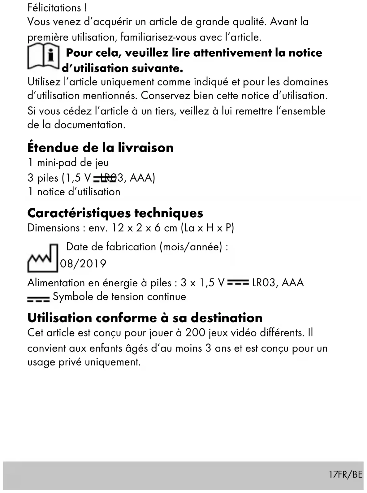 - s‘il présente les qualités qu‘un acheteur peut légitimement attendre eu égard aux déclarations publiques faites par le vendeur, par le producteur ou par son représentant, notamment dans la publicité ou l‘étiquetage ; 2° Ou s‘il présente les caractéristiques définies d‘un commun accord par les parties ou être propre à tout usage spécial recher- ché par l‘acheteur, porté à la connaissance du vendeur et que ce dernier a accepté. Article L217-12 du Code de la consommation L‘action résultant du défaut de conformité se prescrit par deux ans à compter de la délivrance du bien. FR/BE25 Article 1641 du Code civil Le vendeur est tenu de la garantie à raison des défauts cachés de la chose vendue qui la rendent impropre à l‘usage auquel on la destine, ou qui diminuent tellement cet usage que l‘acheteur ne l‘aurait pas acquise, ou n‘en aurait donné qu‘un moindre prix, s‘il les avait connus. Article 1648 1er alinéa du Code civil L‘action résultant des vices rédhibitoires doit être intentée par l‘ac- quéreur dans un délai de deux ans à compter de la découverte du vice. Les pièces détachées indispensables à l’utilisation du produit sont disponibles pendant la durée de la garantie du produit. IAN : 323001_1901 Service Belgique Tel. : 070 270 171 (0,15 EUR/Min.) E-Mail : deltasport@lidl.be FR/BE26 Gefeliciteerd! Met uw aankoop hebt u voor een hoogwaardig artikel gekozen. Zorg ervoor dat u voor de ingebruikname met het artikel ver- trouwd raakt. Lees hiervoor de volgende bedieningshandlei- ding zorgvuldig door. Gebruik het artikel alleen zoals omschreven en voor het aangege- ven doel. Bewaar deze bedieningshandleiding goed. Geef alle documenten mee als u het artikel aan iemand anders geeft. Leveringsomvang 1 x mini joy gaming pad 3 x batterij (1,5 V LR03, AAA) 1 x bedieningshandleiding Technische gegevens Afmetingen: ca. 12 x 2 x 6 cm (b x h x d) Productiedatum (maand/jaar): 08/2019 Stroomvoorziening batterij: 3 x 1,5 V LR03, AAA Symbool voor gelijkspanning Beoogd gebruik Dit artikel is ontworpen voor het spelen van 200 verschillende videospellen. Het is geschikt voor kinderen vanaf 3 jaar en uitslui- tend bestemd voor particulier gebruik. NL/BE27 Veiligheidstips Belangrijk: lees deze bedieningshandleiding zorgvul- dig door en bewaar hem vervolgens goed! Levensgevaar!