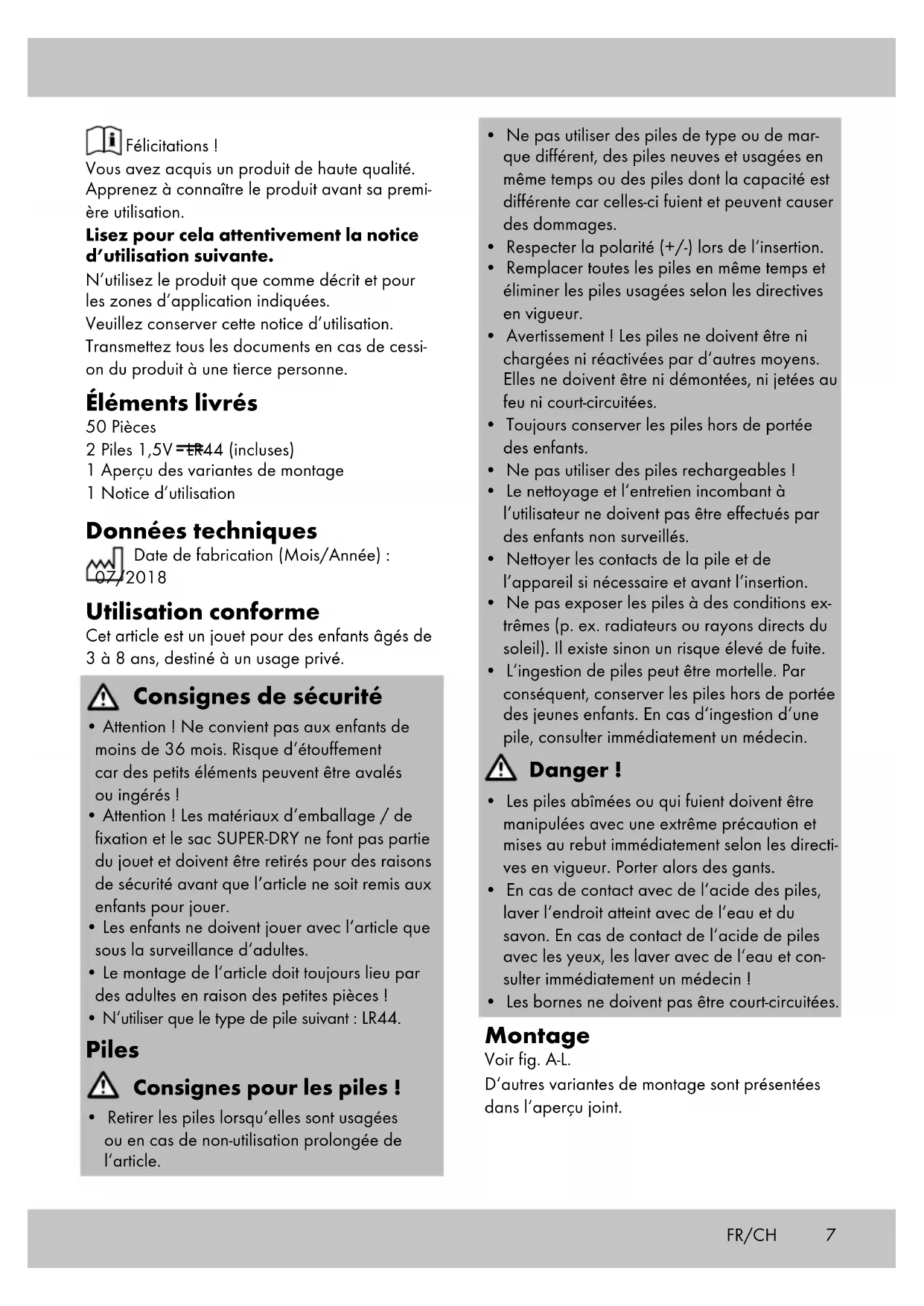- Les bornes ne doivent pas être court-circuitées. Montage Voir fig. A-L. D‘autres variantes de montage sont présentées dans l‘aperçu joint. Félicitations ! Vous avez acquis un produit de haute qualité. Apprenez à connaître le produit avant sa premi- ère utilisation. Lisez pour cela attentivement la notice d’utilisation suivante. N’utilisez le produit que comme décrit et pour les zones d’application indiquées. Veuillez conserver cette notice d’utilisation. Transmettez tous les documents en cas de cessi- on du produit à une tierce personne. Éléments livrés 50 Pièces 2 Piles 1,5V LR44 (incluses) 1 Aperçu des variantes de montage 1 Notice d’utilisation Données techniques Date de fabrication (Mois/Année) : 07/2018 Utilisation conforme Cet article est un jouet pour des enfants âgés de 3 à 8 ans, destiné à un usage privé. Consignes de sécurité