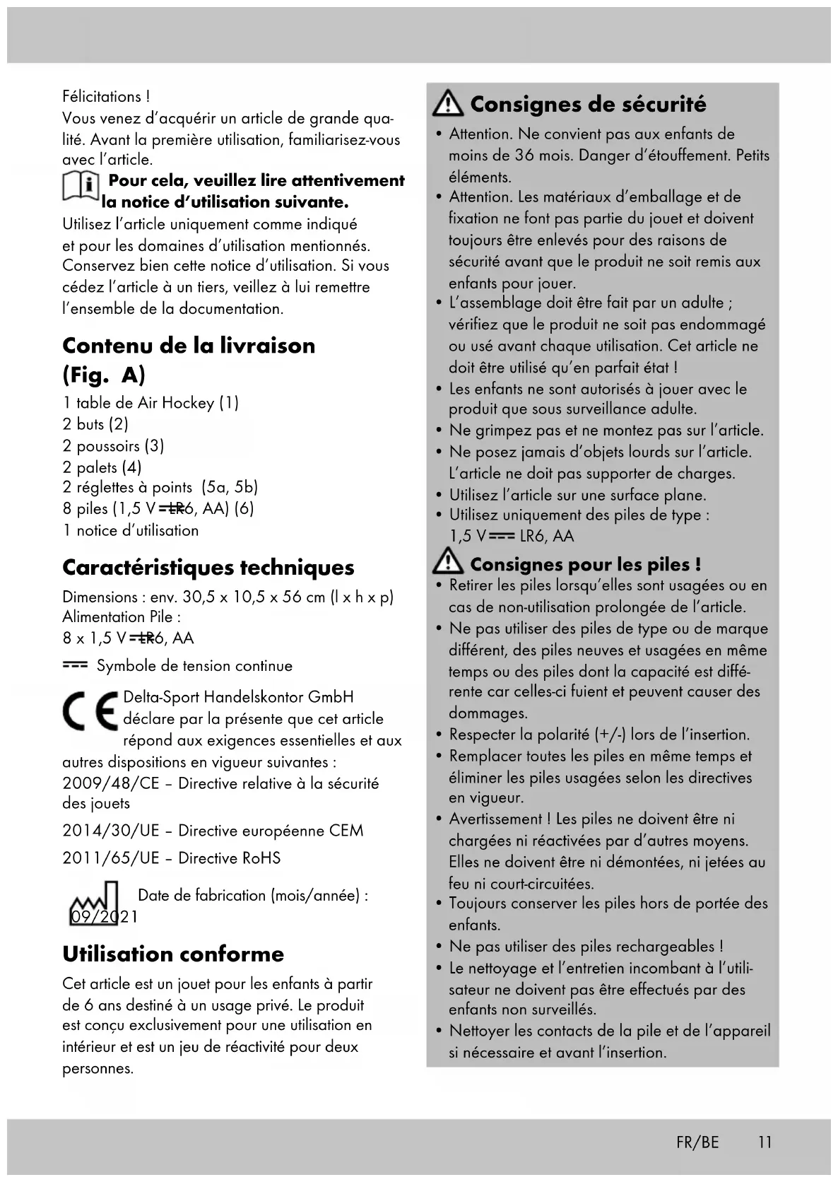 un point. Inscrivez votre nouveau score sur le compteur de points (5). Pour connaître les règles particulières et obtenir des conseils, reportez-vous à la littérature spécia- lisée. FR/BE13 FR/BE Stockage, nettoyage Lorsque vous n’utilisez pas l’article, rangez-le toujours dans un endroit sec, propre, sans piles et à une température ambiante. Essuyez uniquement avec un chiffon de nettoyage à sec. IMPORTANT ! Ne jamais laver avec des produits de nettoyage agressifs. Mise au rebut Afin de protéger l’environnement, ne jetez pas votre article avec les ordures ménagères lorsqu’il ne vous est plus utile, mais jetez-le de façon appropriée. Vous pouvez obtenir des informations sur les points de collecte et leurs heures d’ouverture auprès des autorités compétentes de votre localité. Les piles/batteries défectueuses ou usagées doivent être recyclées conformément à la directive 2006/66/CE et à ses amendements. Retournez les piles/batteries et/ou l’article à travers les possibilités de collecte offertes. Les matériaux d’emballage comme les sacs plastique ne doivent pas tomber entre les mains des enfants. Gardez le matériel d’emballage hors de la portée des enfants. Dommages environnementaux dus à l’élimination inappropriée des piles/ batteries ! Les piles/batteries ne doivent pas être jetées avec les ordures ména- gères. Elles peuvent contenir des métaux lourds toxiques et sont soumises à un traitement spécial des déchets. Les symboles chimiques des métaux lourds sont les suivants : Cd = cadmium, Hg = mercure, Pb = plomb. Alors, retournez les piles/batteries usagées à un point de collecte municipal. Ce produit est recyclable. Il est soumis à la responsabilité élargie du fabricant et est collecté séparément. Jetez l’article et l’emballage dans le respect de l’environnement. Notez le marquage des matériaux d’emballage lors du tri des déchets. Ceux-ci sont marqués par les abréviations (a) et les chiffres (b) avec la signification suivante : 1 - 7 : plastique/20 - 22 : papier et carton/80 - 98 : matériaux composites. L’article et les matériaux d’emballage sont recyclables. Éliminez-les séparément pour une meilleure gestion des déchets. Le logo Triman ne s’applique qu’à la France. Vous pouvez vous renseigner auprès des autorités locales ou munici- pales pour savoir comment vous débarrasser de l’article mis au rebut. Indications concernant la garantie et le service après-vente L’article a été produit avec grand soin et sous un contrôle constant. DELTA-SPORT HANDELSKON- TOR GmbH accorde au client final privé une garantie de trois ans sur cet article à compter de la date d‘achat (période de garantie) conformément aux dispositions suivantes. La garantie ne vaut que pour les défauts de matériaux et de fabrication. La garantie ne couvre pas les pièces soumises à une usure normale, lesquelles doivent donc être considé- rées comme des pièces d’usure (comme par ex. les piles), de même qu’elle ne couvre pas les pièces fragiles, telles que les interrupteurs, les batteries ou les pièces fabriquées en verre. Les réclamations au titre de cette garantie sont exclues si l‘article a été utilisé de manière abusive ou inappropriée, hors du cadre de son usage ou du champ d‘application prévu ou si les instructions de la notice d‘utilisation n‘ont pas été respectées, à moins que le client final ne prouve que l´article présentait un défaut de matériau ou de fabrication n´étant pas dû à l‘une des conditions mentionnées ci-dessus. Les réclamations au titre de la garantie ne peuvent être adressées pendant la période de garantie qu‘en présentant le ticket de caisse original. Veuillez pour cela conserver le ticket de caisse original. Ceci s‘applique également aux pièces remplacées et réparées.14 Si vous avez des plaintes à formuler, veuillez d‘abord contacter le service d‘assistance télépho- nique ci-dessous ou nous contacter par courrier électronique. Si le cas est couvert par la garantie, nous nous engageons - à notre appréciation - à réparer ou à remplacer l‘article gratuitement pour vous ou à vous rembourser le prix d‘achat. Aucun autre droit ne découle de la garantie. Vos droits légaux, en particulier les droits de garan- tie contre le vendeur concerné, ne sont pas limités par cette garantie. Article L217-16 du Code de la consommation Lorsque l‘acheteur demande au vendeur, pendant le cours de la garantie commerciale qui lui a été consentie lors de l‘acquisition ou de la réparation d‘un bien meuble, une remise en état couverte par la garantie, toute période d‘immobilisation d‘au moins sept jours vient s‘ajouter à la durée de la garantie qui restait à courir. Cette période court à compter de la demande d‘intervention de l‘acheteur ou de la mise à disposition pour répara- tion du bien en cause, si cette mise à disposition est postérieure à la demande d‘intervention. Indépendamment de la garantie commerciale souscrite, le vendeur reste tenu des défauts de conformité du bien et des vices rédhibitoires dans les conditions prévues aux articles L217-4 à L217-13 du Code de la consommation et aux articles 1641 à 1648 et 2232 du Code Civil. Article L217-4 du Code de la consommation Le vendeur livre un bien conforme au contrat et répond des défauts de conformité existant lors de la délivrance. Il répond également des défauts de conformité résultant de l‘emballage, des instructions de monta- ge ou de l‘installation lorsque celle-ci a été mise à sa charge par le contrat ou a été réalisée sous sa responsabilité. Article L217-5 du Code de la consommation Le bien est conforme au contrat : 1° S´il est propre à l‘usage habituellement attendu d‘un bien semblable et, le cas échéant : FR/BE