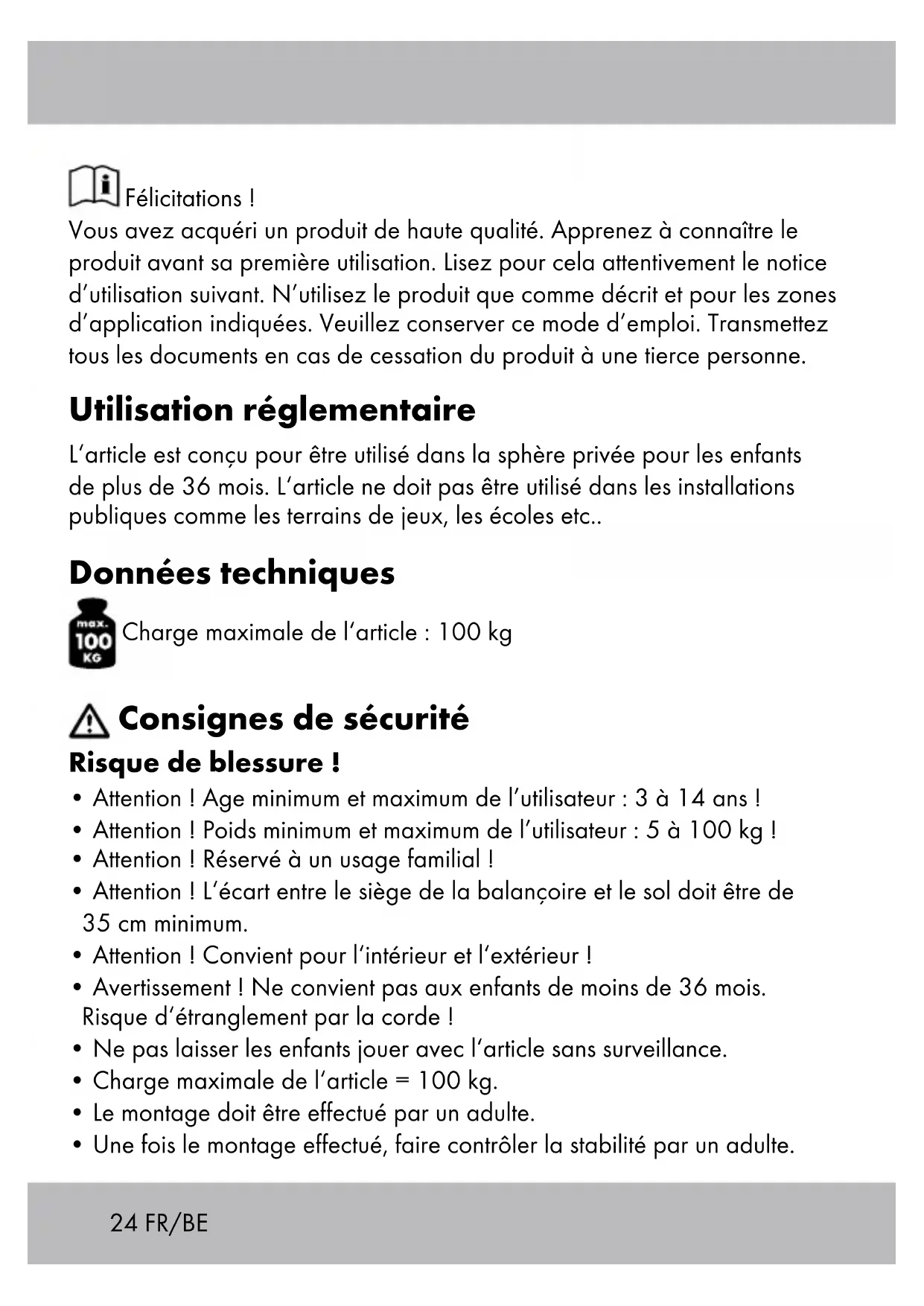- Monter la balançoire uniquement comme décrit dans les présentes instructions, d‘autres méthodes de fixation pouvant endommager la corde ou l‘élément d‘arrêt.