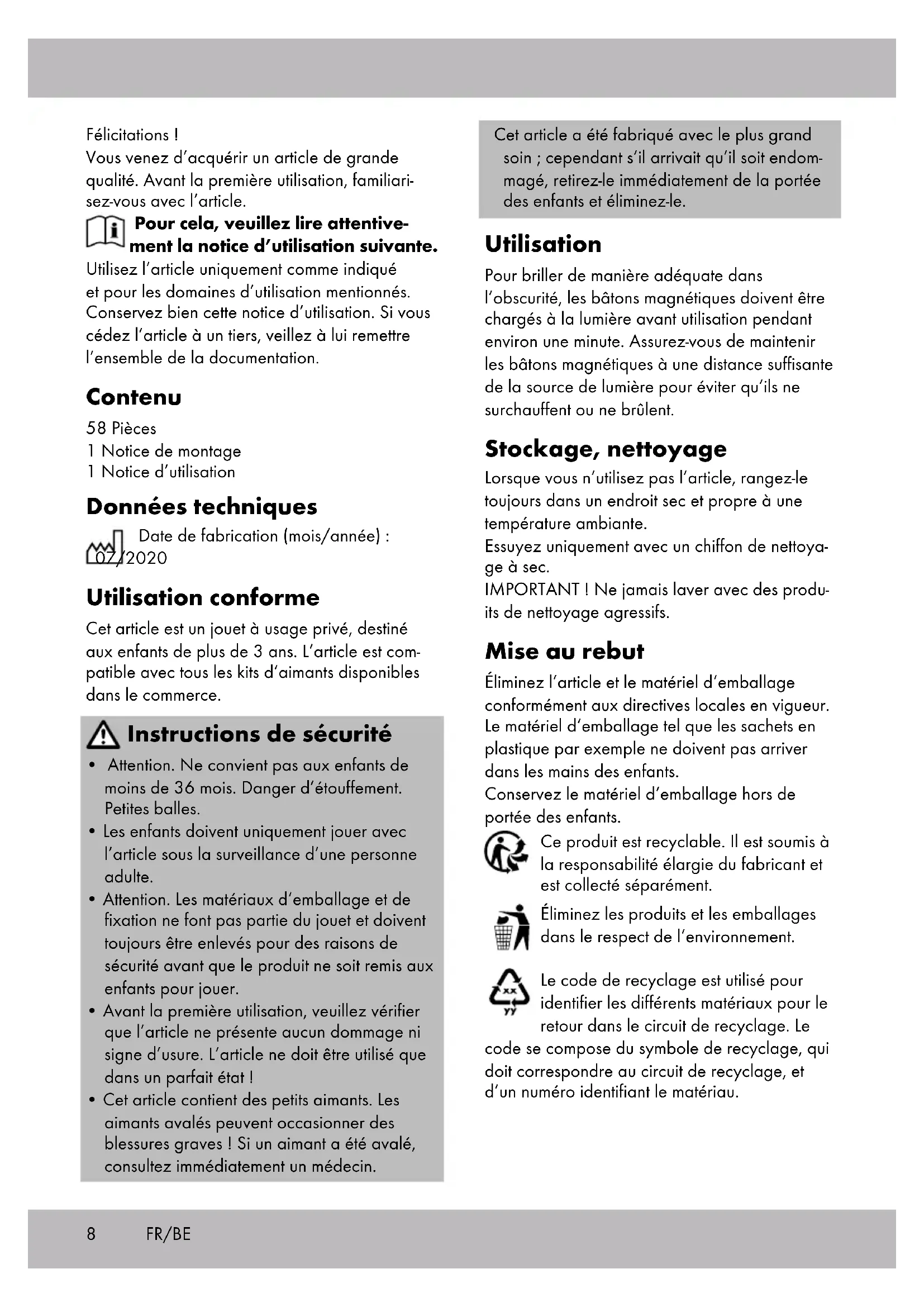 - Cet article contient des petits aimants. Les aimants avalés peuvent occasionner des blessures graves ! Si un aimant a été avalé, consultez immédiatement un médecin. Cet article a été fabriqué avec le plus grand soin ; cependant s’il arrivait qu’il soit endom- magé, retirez-le immédiatement de la portée des enfants et éliminez-le. Utilisation Pour briller de manière adéquate dans l’obscurité, les bâtons magnétiques doivent être chargés à la lumière avant utilisation pendant environ une minute. Assurez-vous de maintenir les bâtons magnétiques à une distance suffisante de la source de lumière pour éviter qu’ils ne surchauffent ou ne brûlent. Stockage, nettoyage Lorsque vous n’utilisez pas l’article, rangez-le toujours dans un endroit sec et propre à une température ambiante. Essuyez uniquement avec un chiffon de nettoya- ge à sec. IMPORTANT ! Ne jamais laver avec des produ- its de nettoyage agressifs. Mise au rebut Éliminez l‘article et le matériel d‘emballage conformément aux directives locales en vigueur. Le matériel d‘emballage tel que les sachets en plastique par exemple ne doivent pas arriver dans les mains des enfants. Conservez le matériel d‘emballage hors de portée des enfants. Ce produit est recyclable. Il est soumis à la responsabilité élargie du fabricant et est collecté séparément. Éliminez les produits et les emballages dans le respect de l‘environnement. Le code de recyclage est utilisé pour identifier les différents matériaux pour le retour dans le circuit de recyclage. Le code se compose du symbole de recyclage, qui doit correspondre au circuit de recyclage, et d’un numéro identifiant le matériau. FR/BE9FR/BE Indications concernant la garantie et le service après- vente Le produit a été fabriqué avec le plus grand soin et sous un contrôle permanent. Vous avez sur ce produit une garantie de trois ans à partir de la date d’achat. Conservez le ticket de caisse. La garantie est uniquement valable pour les défauts de matériaux et de fabrication, elle perd sa validité en cas de maniement incorrect ou non conforme. Vos droits légaux, tout particulière- ment les droits relatifs à la garantie, ne sont pas limitées par cette garantie. En cas d‘éventuelles réclamations, veuillez vous adresser à la hotline de garantie indiquée ci-dessous ou nous contacter par e-mail. Nos employés du service client vous indiqueront la marche à suivre le plus rapidement possible. Nous vous renseignerons personnellement dans tous les cas. La période de garantie n‘est pas prolongée par d’éventuelles réparations sous la garantie, les garanties implicites ou le remboursement. Ceci s‘applique également aux pièces rempla- cées et réparées. Les réparations nécessaires sont à la charge de l’acheteur à la fin de la période de garantie. Article L217-16 du Code de la consommation Lorsque l‘acheteur demande au vendeur, pendant le cours de la garantie commerciale qui lui a été consentie lors de l‘acquisition ou de la réparation d‘un bien meuble, une remise en état couverte par la garantie, toute période d‘immobilisation d‘au moins sept jours vient s‘ajouter à la durée de la garantie qui restait à courir. Cette période court à compter de la demande d‘intervention de l‘acheteur ou de la mise à disposition pour réparation du bien en cause, si cette mise à disposition est postérieure à la demande d‘intervention. Indépendamment de la garantie commerciale souscrite, le vendeur reste tenu des défauts de conformité du bien et des vices rédhibitoires dans les conditions prévues aux articles L217-4 à L217-13 du Code de la consommation et aux articles 1641 à 1648 et 2232 du Code Civil. Article L217-4 du Code de la consommation Le vendeur livre un bien conforme au contrat et répond des défauts de conformité existant lors de la délivrance. Il répond également des défauts de conformité résultant de l‘emballage, des Notice de monta- ge ou de l‘installation lorsque celle-ci a été mise à sa charge par le contrat ou a été réalisée sous sa responsabilité. Article L217-5 du Code de la consommation Le bien est conforme au contrat : 1° S´il est propre à l‘usage habituellement attendu d‘un bien semblable et, le cas échéant :