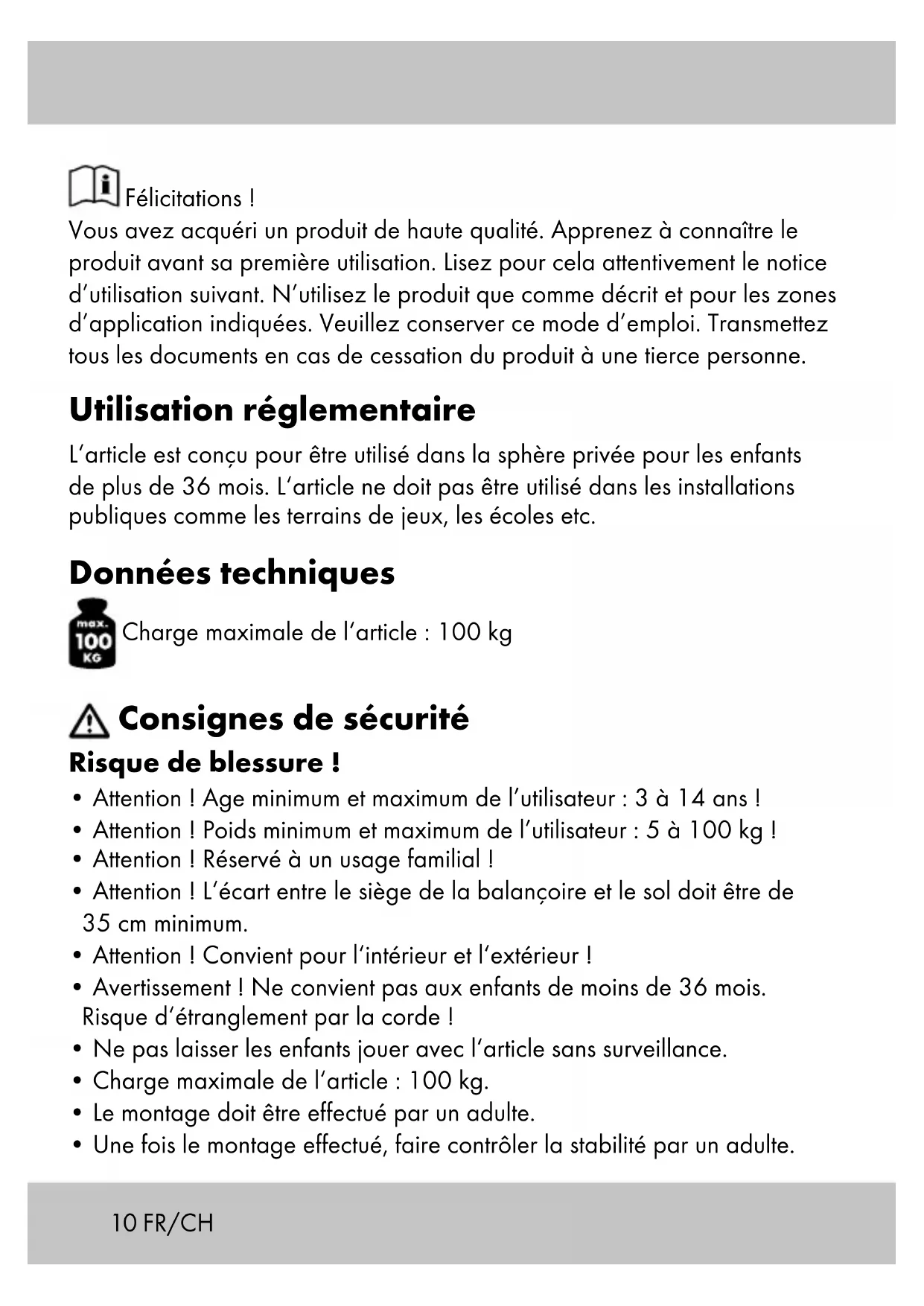- Charge maximale de l‘article : 100 kg.