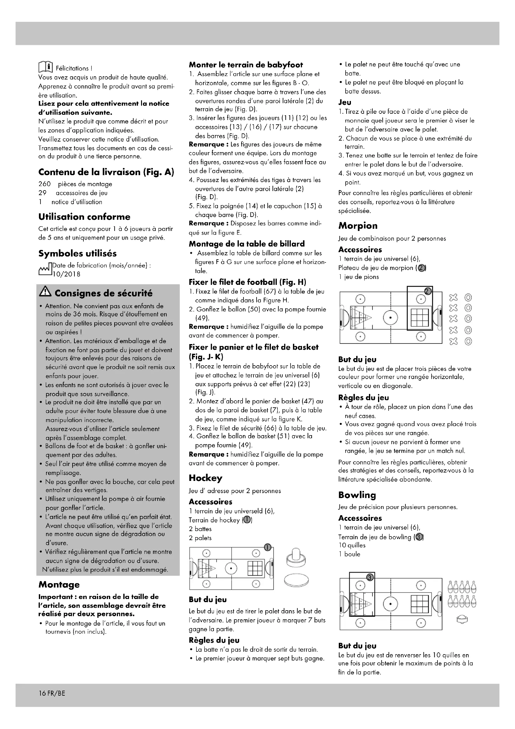 - s‘il présente les qualités qu‘un acheteur peut légitimement attendre eu égard aux déclara- tions publiques faites par le vendeur, par le producteur ou par son représentant, notam- ment dans la publicité ou l‘étiquetage ; 2° Ou s‘il présente les caractéristiques définies d‘un commun accord par les parties ou être propre à tout usage spécial recherché par l‘acheteur, porté à la connaissance du vendeur et que ce dernier a accepté. Article L217-12 du Code de la consommation L‘action résultant du défaut de conformité se prescrit par deux ans à compter de la délivrance du bien. Article 1641 du Code civil Le vendeur est tenu de la garantie à raison des défauts cachés de la chose vendue qui la ren- dent impropre à l‘usage auquel on la destine, ou qui diminuent tellement cet usage que l‘acheteur ne l‘aurait pas acquise, ou n‘en aurait donné qu‘un moindre prix, s‘il les avait connus. Article 1648 1er alinéa du Code civil L‘action résultant des vices rédhibitoires doit être intentée par l‘acquéreur dans un délai de deux ans à compter de la découverte du vice. Les pièces détachées indispensables à l’utilisation du produit sont disponibles pendant la durée de la garantie du produit. IAN : 306207 Service Belgique Tel. : 070 270 171 (0,15 EUR/Min.) E-Mail : deltasport@lidl.be22 NL/BE Hartelijk gefeliciteerd! Met de aankoop hebt u gekozen voor een hoogwaardig product. Maak u daarom voor de eerste ingebruikname vertrouwd met het product. Lees hiervoor deze gebruiksaanwijzing aandachtig door. Gebruik het product alleen zoals beschreven en uitsluitend voor de aangegeven doeleinden. Bewaar de handleiding zorgvuldig. Als u het product aan derden geeft, dient u ook deze documenten te overhandigen. In het leveringspakket inbe- grepen (afb. A) 260 x onderdeel montage 29 x spelaccessoires 1 x gebruiksaanwijzing Voorgeschreven gebruik Dit artikel is voor 1-6 speler(s) met een leeftijd vanaf 5 jaar en uitsluitend voor privégebruik bestemd. Gebruikte symbolen Productiedatum (maand/jaar): 10/2018 Veiligheidsinstructies