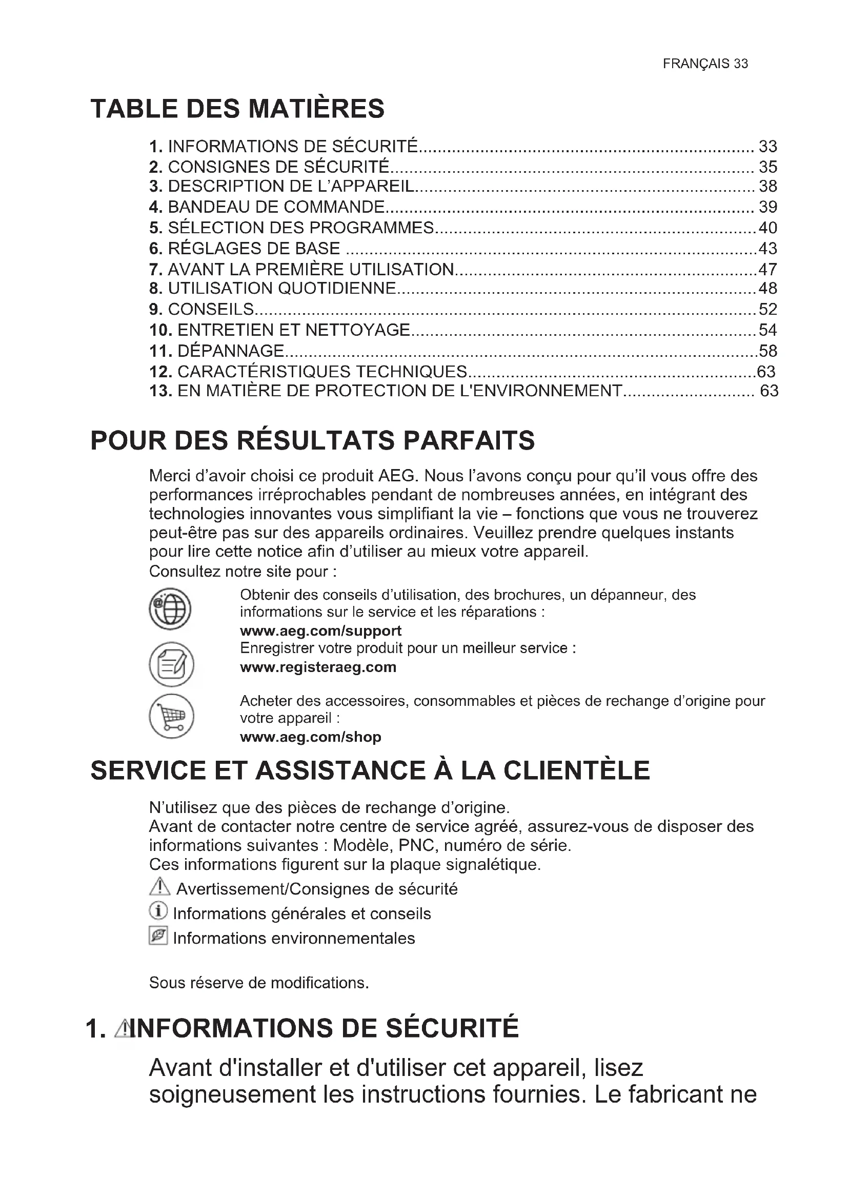 Merci d’avoir choisi ce produit AEG. Nous l’avons conçu pour qu’il vous offre des performances irréprochables pendant de nombreuses années, en intégrant des technologies innovantes vous simplifiant la vie – fonctions que vous ne trouverez peut-être pas sur des appareils ordinaires. Veuillez prendre quelques instants pour lire cette notice afin d’utiliser au mieux votre appareil. Consultez notre site pour : Obtenir des conseils d’utilisation, des brochures, un dépanneur, des informations sur le service et les réparations : www.aeg.com/support Enregistrer votre produit pour un meilleur service : www.registeraeg.com Acheter des accessoires, consommables et pièces de rechange d’origine pour votre appareil : www.aeg.com/shop