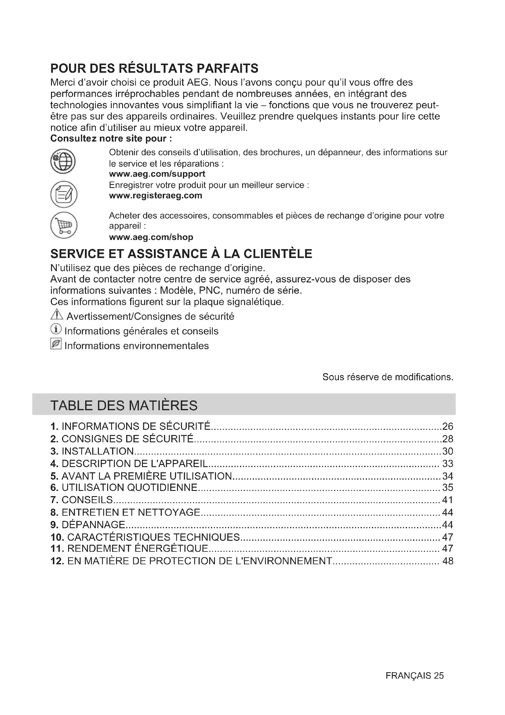Merci d’avoir choisi ce produit AEG. Nous l’avons conçu pour qu’il vous offre des performances irréprochables pendant de nombreuses années, en intégrant des technologies innovantes vous simplifiant la vie – fonctions que vous ne trouverez peut- être pas sur des appareils ordinaires. Veuillez prendre quelques instants pour lire cette notice afin d’utiliser au mieux votre appareil. Consultez notre site pour : Obtenir des conseils d’utilisation, des brochures, un dépanneur, des informations sur le service et les réparations : www.aeg.com/support Enregistrer votre produit pour un meilleur service : www.registeraeg.com Acheter des accessoires, consommables et pièces de rechange d’origine pour votre appareil : www.aeg.com/shop