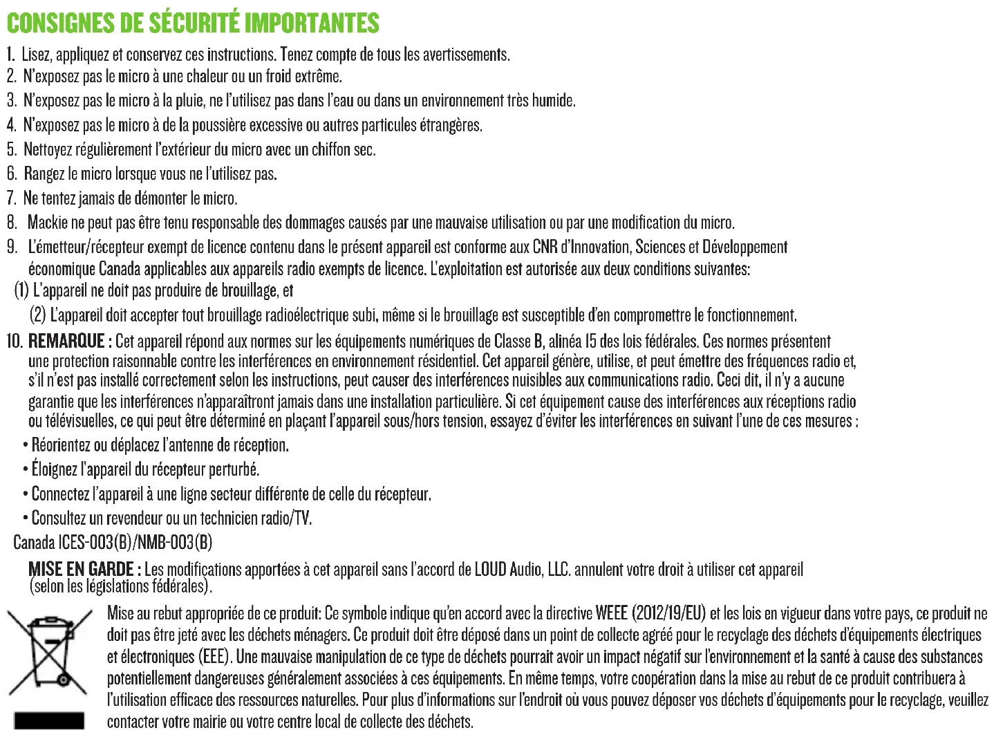 8. Mackie ne peut pas être tenu responsable des dommages causés par une mauvaise utilisation ou par une modification du micro. 9. L’émetteur/récepteur exempt de licence contenu dans le présent appareil est conforme aux CNR d’Innovation, Sciences et Développement économique Canada applicables aux appareils radio exempts de licence. L’exploitation est autorisée aux deux conditions suivantes: () L’appareil ne doit pas produire de brouillage, et (2) L’appareil doit accepter tout brouillage radioélectrique subi, même si le brouillage est susceptible d’en compromettre le fonctionnement. 0. REMARQUE : Cet appareil répond aux normes sur les équipements numériques de Classe B, alinéa 15 des lois fédérales. Ces normes présentent une protection raisonnable contre les interférences en environnement résidentiel. Cet appareil génère, utilise, et peut émettre des fréquences radio et, s’il n’est pas installé correctement selon les instructions, peut causer des interférences nuisibles aux communications radio. Ceci dit, il n’y a aucune garantie que les interférences n’apparaîtront jamais dans une installation particulière. Si cet équipement cause des interférences aux réceptions radio ou télévisuelles, ce qui peut être déterminé en plaçant l’appareil sous/hors tension, essayez d’éviter les interférences en suivant l’une de ces mesures :
