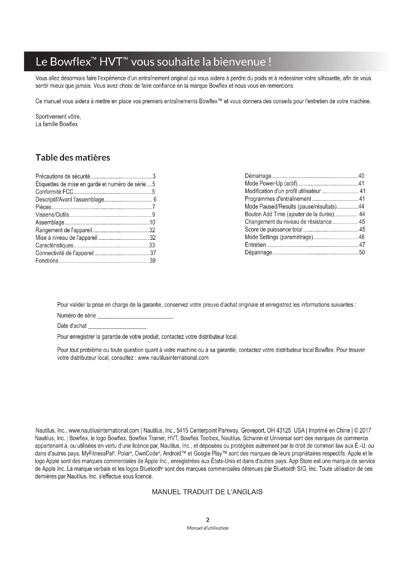 vous souhaite la bienvenue! Nautilus, Inc., www.nautilusinternational.com | Nautilus, Inc., 5415 Centerpoint Parkway, Groveport, OH 43125 USA | Imprimé en Chine | © 2017 Nautilus, Inc. | Bowex, le logo Bowex, Bowex Trainer, HVT, Bowex Toolbox, Nautilus, Schwinn et Universal sont des marques de commerce appartenant à, ou utilisées en vertu d’une licence par, Nautilus, Inc., et déposées ou protégées autrement par le droit de common law aux É.-U. ou dans d’autres pays. MyFitnessPal