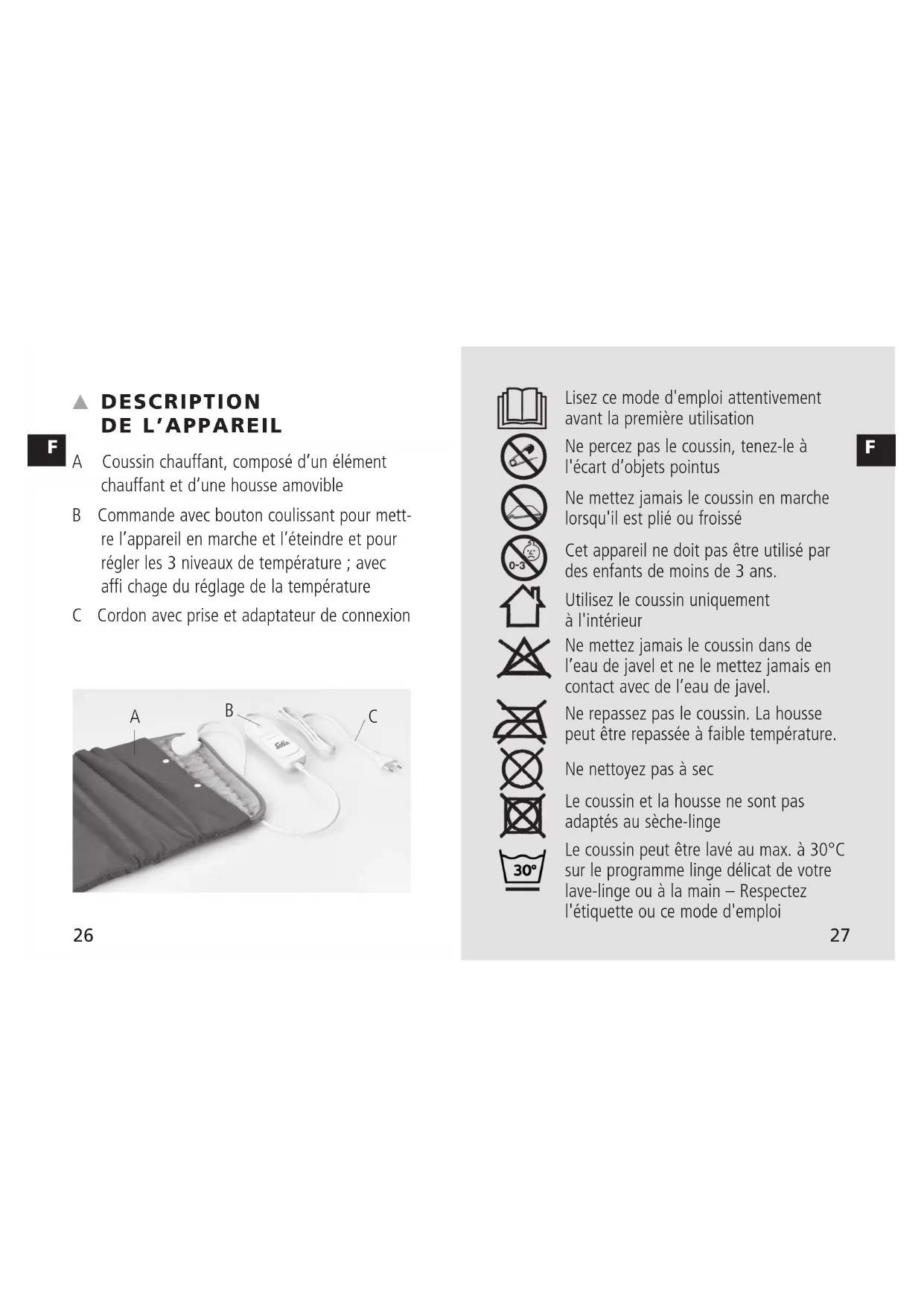 A Coussin chauffant, composé d’un élément chauffant et d’une housse amovible B Commande avec bouton coulissant pour mett- re l’appareil en marche et l’éteindre et pour régler les 3 niveaux de température ; avec affi chage du réglage de la température C Cordon avec prise et adaptateur de connexion Lisez ce mode d'emploi attentivement avant la première utilisation Ne percez pas le coussin, tenez-le à l'écart d’objets pointus Ne mettez jamais le coussin en marche lorsqu'il est plié ou froissé Utilisez le coussin uniquement à l'intérieur Cet appareil ne doit pas être utilisé par des enfants de moins de 3 ans. Ne mettez jamais le coussin dans de l’eau de javel et ne le mettez jamais en contact avec de l’eau de javel. Ne repassez pas le coussin. La housse peut être repassée à faible température. Ne nettoyez pas à sec Le coussin et la housse ne sont pas adaptés au sèche-linge Le coussin peut être lavé au max. à 30°C sur le programme linge délicat de votre lave-linge ou à la main – Respectez l'étiquette ou ce mode d'emploi29