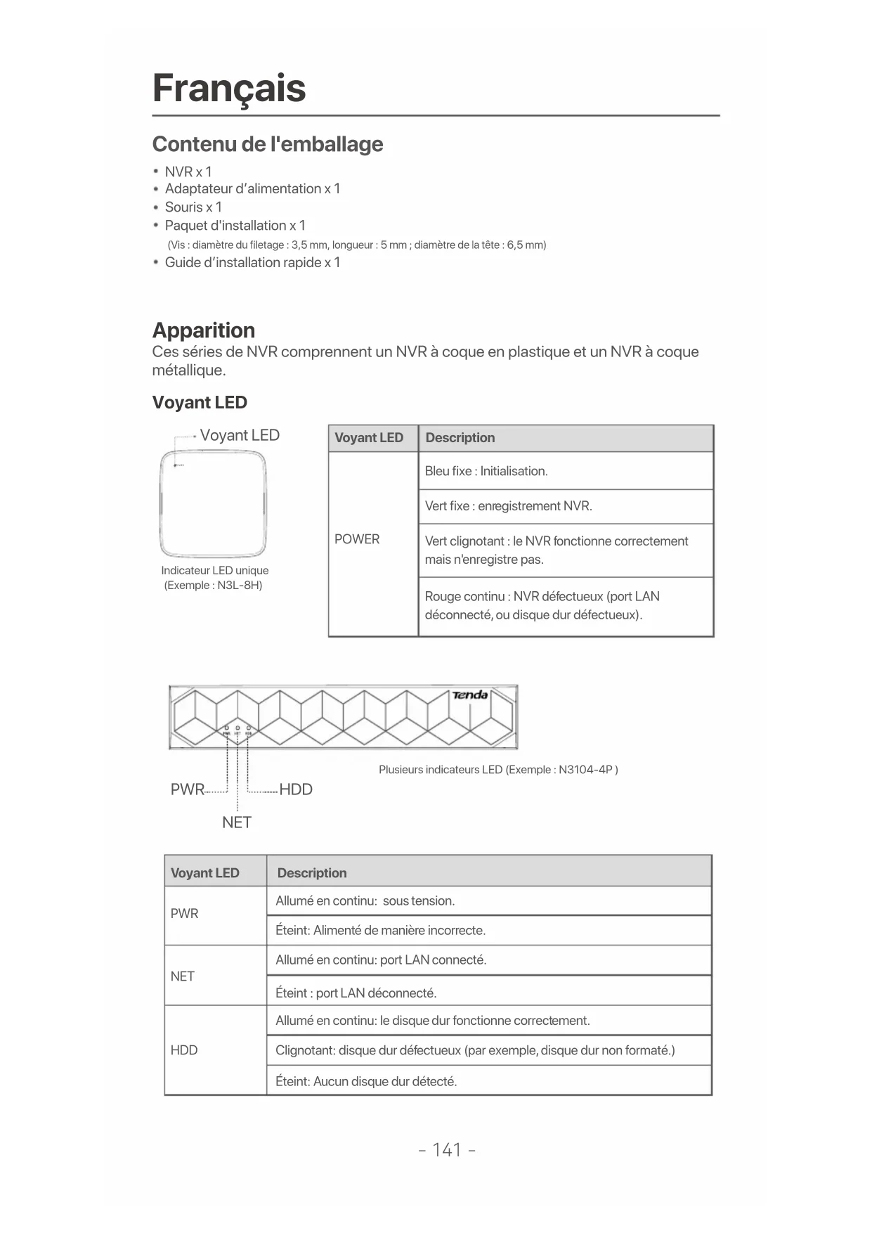 NVR ordinaire (Exemple: N3L-8H)- 143 - Borne de mise à la terre.Connectez la borne de mise à la terre du NVR à la terre ou à la borne de terre du bâtiment avec un câble de mise à la terre pour empêcher l'électricité statique ou la foudre d'endommager le NVR.Port d'alimentation.Utilisez l'adaptateur secteur inclus pour allumer le NVR.Port Fast Ethernet, qui prend en charge l'alimentation PoE IEEE 802.3af/at. Utilisé pour se connecter aux caméras.POWER PoE PORTS LAN AUDIO AUDIO OUT HDMI VGA USB Port LAN Ethernet rapide.Utilisé pour se connecter à des périphériques tels que le routeur et le commutateur.Port d'entrée audio.Utilisé pour se connecter aux périphériques d'entrée audio, tels que les micros.Port de sortie audio.Utilisé pour se connecter à des périphériques de sortie audio, tels que des haut-parleurs actifs.Prise HDMI.Connectez votre moniteur ou téléviseur à ce port à l'aide d'un câble HDMI pour la sortie audio et vidéo.Port VGA.Connectez votre moniteur à ce port à l'aide d'un câble VGA pour la sortie vidéo.Prise USB 2.0.Utilisé pour se connecter à des périphériques tels qu'une souris et un périphérique de stockage USB. DescriptionPort Conseils - Câble Ethernet recommandé : CAT 5 ou supérieur. - Distance d'alimentation:
