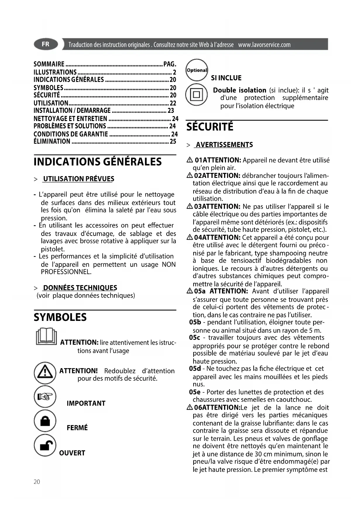 (voir plaque données techniques) SYMBOLES ATTENTION: lire attentivement les istruc- tions avant l’usage ATTENTION! Redoublez d’attention pour des motifs de sécurité. IMPORTANT FERMÉ OUVERT SI INCLUE Double isolation (si inclue): il s ' agit d'une protection supplémentaire pour l'isolation électrique SÉCURITÉ > AVERTISSEMENTS 01ATTENTION: Appareil ne devant être utilisé qu’en plein air. 02ATTENTION: débrancher toujours l’alimen