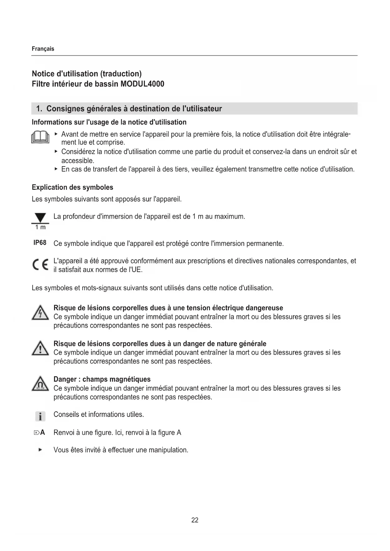 chantes. Personne ne devra pouvoir marcher sur le câble s'il est posé sans gaine dans la terre ou dans du gravier. ‧ Eectuez exclusivement des travaux qui sont décrits dans cette notice. ‧ Ne procédez jamais à des modications techniques sur l'appareil. ‧ Utilisez uniquement des pièces de rechange et accessoires d’origine pour cet appareil. ‧ Utilisez l'appareil uniquement quand il n'y a personne dans le bassin ! ‧ L'appareil est doté d'un aimant créant un fort champ magnétique apte à agir sur un stimulateur cardiaque ou des débrillateurs implantés (ICD). Observez une distance d'au moins 30 cm entre l'implant et l'aimant.