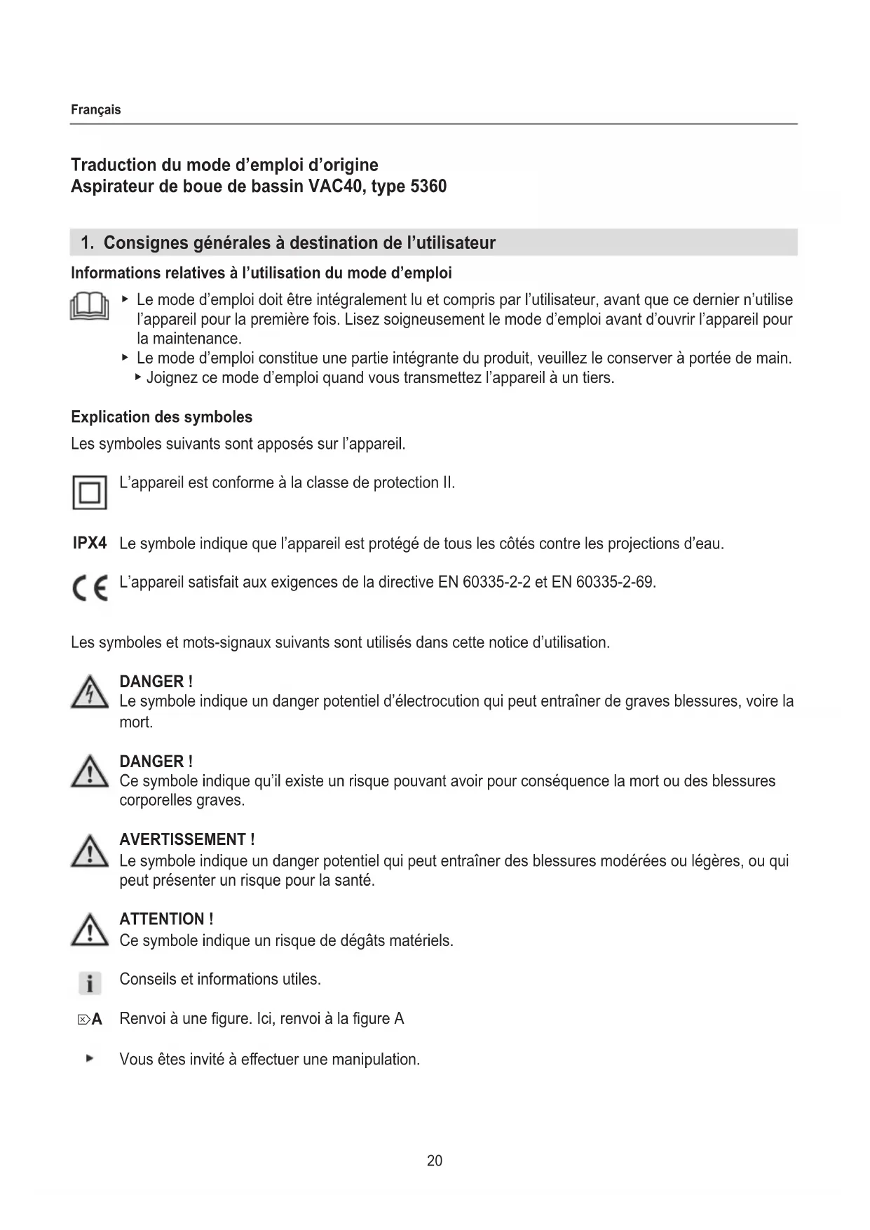 Informations relatives à l’utilisation du mode d’emploi ▶ Le mode d’emploi doit être intégralement lu et compris par l’utilisateur, avant que ce dernier n’utilise l’appareil pour la première fois. Lisez soigneusement le mode d’emploi avant d’ouvrir l’appareil pour la maintenance. ▶ Le mode d’emploi constitue une partie intégrante du produit, veuillez le conserver à portée de main. ▶ Joignez ce mode d’emploi quand vous transmettez l’appareil à un tiers. Explication des symboles Les symboles suivants sont apposés sur l’appareil. L’appareil est conforme à la classe de protection II. Le symbole indique que l’appareil est protégé de tous les côtés contre les projections d’eau. L’appareil satisfait aux exigences de la directive EN 60335-2-2 et EN 60335-2-69. Les symboles et mots-signaux suivants sont utilisés dans cette notice d’utilisation. DANGER ! Le symbole indique un danger potentiel d’électrocution qui peut entraîner de graves blessures, voire la mort. DANGER ! Ce symbole indique qu’il existe un risque pouvant avoir pour conséquence la mort ou des blessures corporelles graves. AVERTISSEMENT ! Le symbole indique un danger potentiel qui peut entraîner des blessures modérées ou légères, ou qui peut présenter un risque pour la santé. ATTENTION ! Ce symbole indique un risque de dégâts matériels. Conseils et informations utiles. Renvoi à une gure. Ici, renvoi à la gure A Vous êtes invité à eectuer une manipulation. IPX4 ⌦A21 Français Plaque signalétique