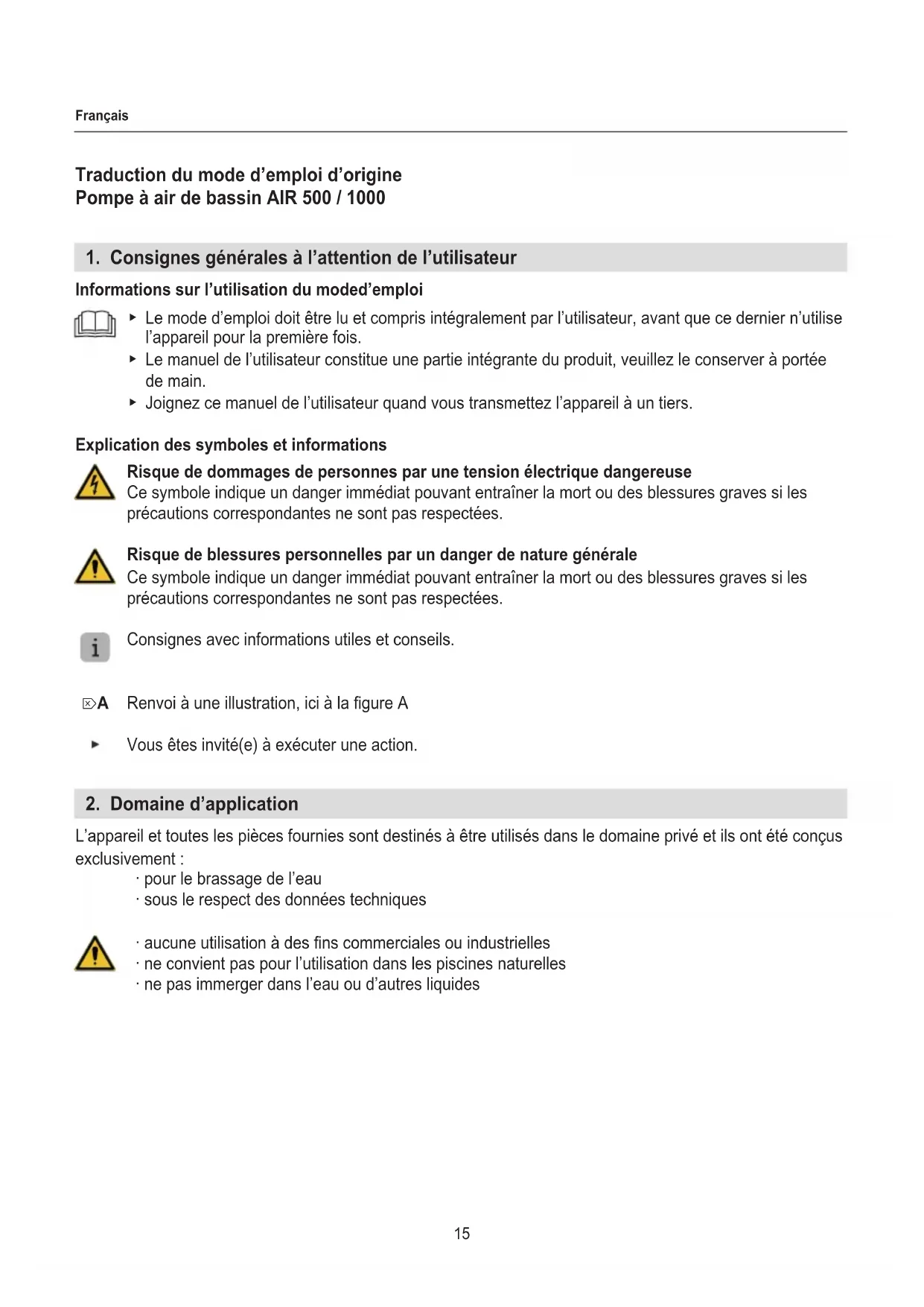 See page 75.15 Français Traduction du mode d’emploi d’origine Pompe à air de bassin AIR 500 / 1000
