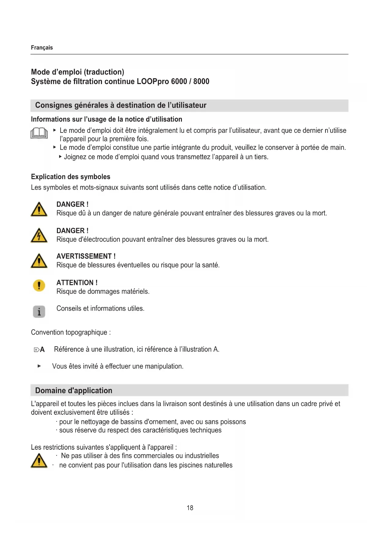 Disposal When disposing of the appliance, pay attention to the relevant statutory regulations. The appliance may no longer be disposed of with the municipal or household waste. The appliance will be accepted free of charge at municipal collection points or recycling centres. The product packaging is made up of recyclable materials. Dispose of them in an environmentally responsible manner and take them for recycling.18 Français Mode d’emploi (traduction) Système de ltration continue LOOPpro 6000 / 8000 Consignes générales à destination de l’utilisateur Informations sur l’usage de la notice d’utilisation ▶ Le mode d’emploi doit être intégralement lu et compris par l’utilisateur, avant que ce dernier n’utilise l’appareil pour la première fois. ▶ Le mode d’emploi constitue une partie intégrante du produit, veuillez le conserver à portée de main. ▶ Joignez ce mode d’emploi quand vous transmettez l’appareil à un tiers. Explication des symboles Les symboles et mots-signaux suivants sont utilisés dans cette notice d’utilisation. DANGER ! Risque dû à un danger de nature générale pouvant entraîner des blessures graves ou la mort. DANGER ! Risque d'électrocution pouvant entraîner des blessures graves ou la mort. AVERTISSEMENT ! Risque de blessures éventuelles ou risque pour la santé. ATTENTION ! Risque de dommages matériels. Conseils et informations utiles. Convention topographique : Référence à une illustration, ici référence à l’illustration A. Vous êtes invité à eectuer une manipulation.
