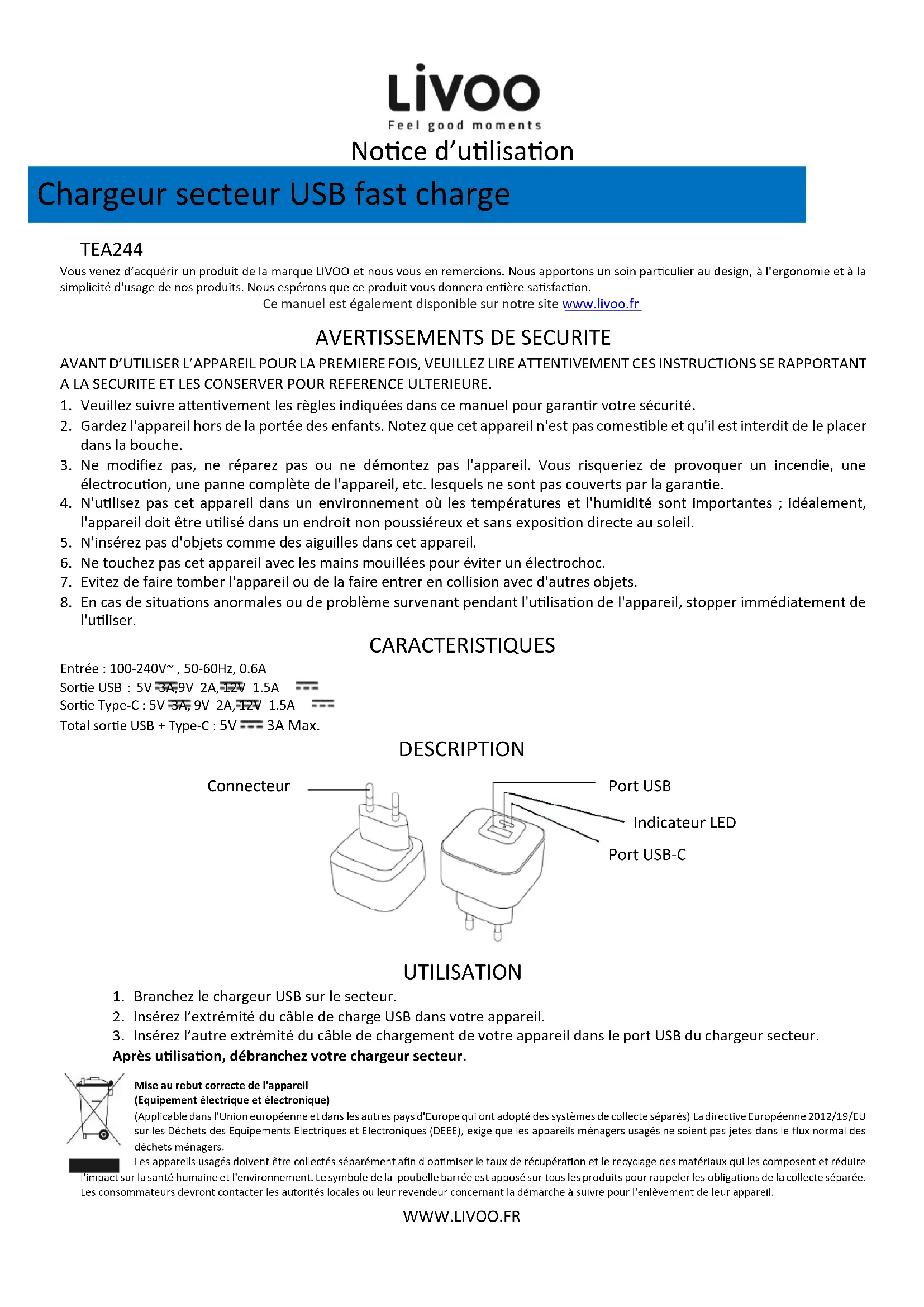 Après utilisation, débranchez votre chargeur secteur. Mise au rebut correcte de l'appareil (Equipement électrique et électronique) (Applicable dans l'Union européenne et dans les autres pays d'Europe qui ont adopté des systèmes de collecte séparés) La directive Européenne 2012/19/EU sur les Déchets des Equipements Electriques et Electroniques (DEEE), exige que les appareils ménagers usagés ne soient pas jetés dans le flux normal des déchets ménagers. Les appareils usagés doivent être collectés séparément afin d'optimiser le taux de récupération et le recyclage des matériaux qui les composent et réduire l'impact sur la santé humaine et l'environnement. Le symbole de la poubelle barrée est apposé sur tous les produits pour rappeler les obligations de la collecte séparée. Les consommateurs devront contacter les autorités locales ou leur revendeur concernant la démarche à suivre pour l'enlèvement de leur appareil. Chargeur secteur USB fast charge Indicateur LED Port USB Connecteur Port USB-CUser manual