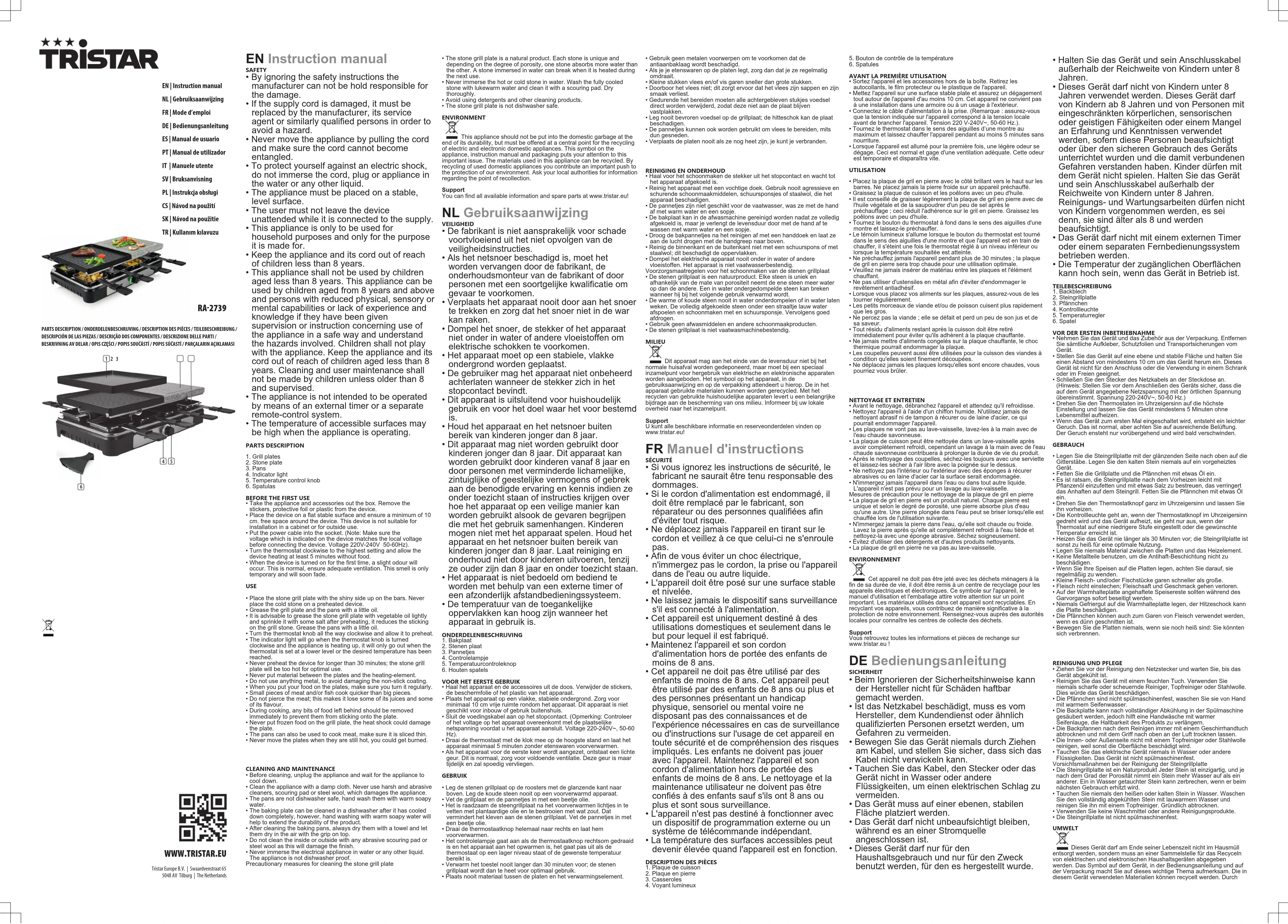 - La température des surfaces accessibles peut devenir élevée quand l'appareil est en fonction. DESCRIPTION DES PIÈCES1. Plaque de cuisson2. Plaque en pierre3. Casseroles4. Voyant lumineux5. Bouton de contrôle de la température6. SpatulesAVANT LA PREMIÈRE UTILISATION• Sortez l'appareil et les accessoires hors de la boîte.Retirez lesautocollants, le film protecteur ou le plastique de l'appareil.• Mettez l'appareil sur une surface stable plate et assurez un dégagementtout autour de l'appareil d'au moins 10 cm. Cet appareil ne convient pasà une installation dans une armoire ou à un usage à l'extérieur.• Connectez le câble d'alimentation à la prise. (Remarque : assurez-vousque la tension indiquée sur l'appareil correspond à la tension localeavant de brancher l'appareil. Tension 220 V-240V~, 50-60 Hz.).• Tournez le thermostat dans le sens des aiguilles d’une montre aumaximum et laissez chauffer l'appareil pendant au moins 5 minutes sansnourriture.• Lorsque l'appareil est allumé pour la première fois, une légère odeur sedégage. Ceci est normal et gage d'une ventilation adéquate. Cette odeurest temporaire et disparaîtra vite.UTILISATION• Placez la plaque de gril en pierre avec le côté brillant vers le haut sur lesbarres. Ne placez jamais la pierre froide sur un appareil préchauffé.• Graissez la plaque de cuisson et les poêlons avec un peu d'huile.• Il est conseillé de graisser légèrement la plaque de gril en pierre avec del'huile végétale et de la saupoudrer d'un peu de sel après lepréchauffage ; ceci réduit l'adhérence sur le gril en pierre. Graissez lespoêlons avec un peu d'huile.• Tournez le bouton du thermostat à fond dans le sens des aiguilles d'unemontre et laissez-le préchauffer.• Le témoin lumineux s'allume lorsque le bouton du thermostat est tournédans le sens des aiguilles d'une montre et que l'appareil est en train dechauffer, il s'éteint une fois le thermostat réglé à un niveau inférieur oulorsque la température souhaitée est atteinte.• Ne préchauffez jamais l'appareil pendant plus de 30 minutes ; la plaquede gril en pierre sera trop chaude pour une utilisation optimale.• Veuillez ne jamais insérer de matériau entre les plaques et l'élémentchauffant.• Ne pas utiliser d'ustensiles en métal afin d'éviter d'endommager lerevêtement antiadhésif.• Lorsque vous placez vos aliments sur les plaques, assurez-vous de lestourner régulièrement.• Les petits morceaux de viande et/ou de poisson cuisent plus rapidementque les gros.• Ne percez pas la viande; elle se défait et perd un peu de son jus et desa saveur.• Tout résidu d'aliments restant après la cuisson doit être retiréimmédiatement pour éviter qu'ils adhèrent à la plaque chauffante.• Ne jamais mettre d'aliments congelés sur la plaque chauffante, le chocthermique pourrait endommager la plaque.• Les coupelles peuvent aussi être utilisées pour la cuisson des viandes àcondition qu'elles soient finement découpées.• Ne déplacez jamais les plaques lorsqu'elles sont encore chaudes, vouspourriez vous brûler.NETTOYAGE ET ENTRETIEN• Avant le nettoyage, débranchez l'appareil et attendez qu'il refroidisse.• Nettoyez l'appareil à l'aide d'un chiffon humide. N'utilisez jamais denettoyant abrasif ni de tampon à récurer ou de laine d'acier, ce quipourrait endommager l'appareil.• Les plaques ne vont pas au lave-vaisselle, lavez-les à la main avec del'eau chaude savonneuse.• La plaque de cuisson peut être nettoyée dans un lave-vaisselle aprèsavoir complètement refroidi, cependant un lavage à la main avec de l'eauchaude savonneuse contribuera à prolonger la durée de vie du produit.• Après le nettoyage des coupelles, séchez-les toujours avec une servietteet laissez-les sécher à l'air libre avec la poignée sur le dessus.• Ne nettoyez pas l'intérieur ou l'extérieur avec des éponges à récurerabrasives ou en laine d'acier car la surface serait endommagée.• N'immergez jamais l'appareil dans l'eau ou dans tout autre liquide.L'appareil n'est pas prévu pour un lavage au lave-vaisselle.Mesures de précaution pour le nettoyage de la plaque de gril en pierre• La plaque de gril en pierre est un produit naturel. Chaque pierre estunique et selon le degré de porosité, une pierre absorbe plus d'eauqu'une autre. Une pierre plongée dans l'eau peut se briser lorsqu'elle estchauffée lors de l'utilisation suivante.• N'immergez jamais la pierre dans l'eau, qu'elle soit chaude ou froide.Lavez la pierre après qu'elle ait complètement refroidi à l'eau tiède etnettoyez-la avec une éponge abrasive. Séchez soigneusement.• Évitez d'utiliser des détergents et d'autres produits nettoyants.• La plaque de gril en pierre ne va pas au lave-vaisselle.ENVIRONNEMENTCet appareil ne doit pas être jeté avec les déchets ménagers à lafin de sa durée de vie, il doit être remis à un centre de recyclage pour lesappareils électriques et électroniques. Ce symbole sur l'appareil, lemanuel d'utilisation et l'emballage attire votre attention sur un pointimportant. Les matériaux utilisés dans cet appareil sont recyclables. Enrecyclant vos appareils, vous contribuez de manière significative à laprotection de notre environnement. Renseignez-vous auprès des autoritéslocales pour connaître les centres de collecte des déchets.SupportVous retrouvez toutes les informations et pièces de rechange surwww.tristar.eu! DEBedienungsanleitung SICHERHEIT