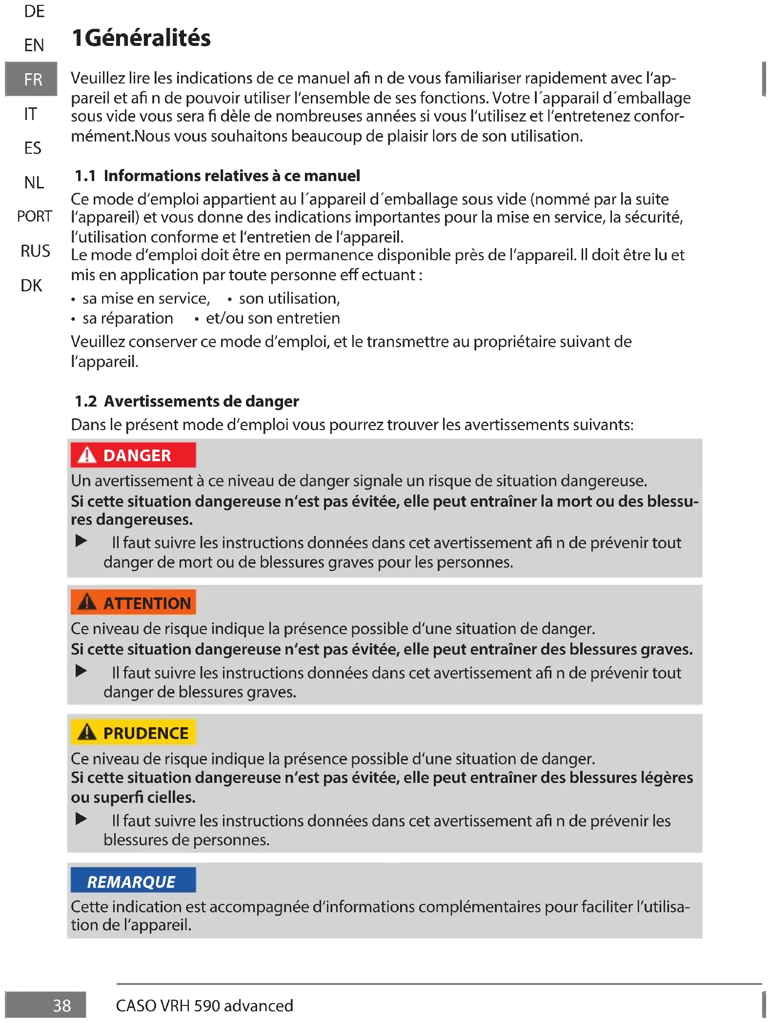 Dans le présent mode d‘emploi vous pourrez trouver les avertissements suivants: Un avertissement à ce niveau de danger signale un risque de situation dangereuse. Si cette situation dangereuse n‘est pas évitée, elle peut entraîner la mort ou des blessu- res dangereuses. Il faut suivre les instructions données dans cet avertissement a n de prévenir tout danger de mort ou de blessures graves pour les personnes. Ce niveau de risque indique la présence possible d‘une situation de danger. Si cette situation dangereuse n‘est pas évitée, elle peut entraîner des blessures graves. Il faut suivre les instructions données dans cet avertissement a n de prévenir tout danger de blessures graves. Ce niveau de risque indique la présence possible d‘une situation de danger. Si cette situation dangereuse n‘est pas évitée, elle peut entraîner des blessures légères ou super cielles. Il faut suivre les instructions données dans cet avertissement a n de prévenir les blessures de personnes. Cette indication est accompagnée d‘informations complémentaires pour faciliter l‘utilisa- tion de l‘appareil. DANGER ATTENTION PRUDENCE REMARQUE39 CASO VRH 590 advanced