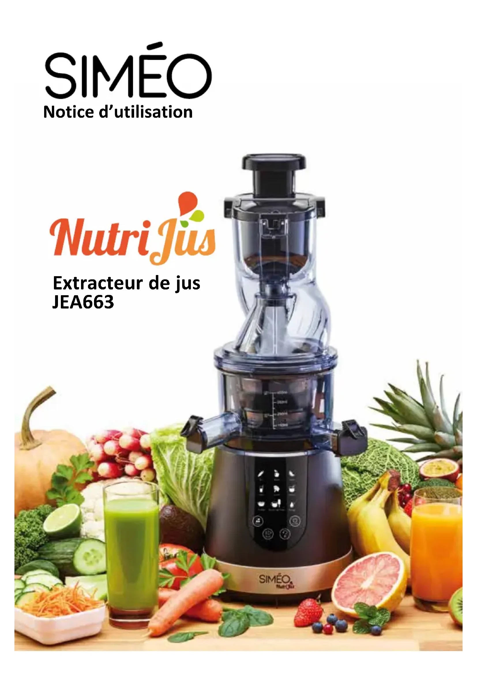 Extracteur de jus JEA663 Notice d’utilisationDESCRIPTIF TECHNIQUE Vous venez d’acquérir un produit de la gamme NutriJus de Siméo. Ce dernier a été conçu avec soin et a été soumis à de nombreux tests de contrôle. Nous vous remercions de la confiance portée à notre marque et souhaitons que cet appareil vous apporte entière satisfaction. Nous vous demandons de lire attentivement cette notice dans son intégralité avant d’utiliser votre appareil. Conservez-la, vous pourriez avoir besoin de vous y référer dans le futur. panneau de contrôle verseuse à jus bac à pulpe sore à clapet pour la pulpe sore à clapet pour le jus bol panier tamis pour jus tamis pour sorbet râpe et disque éminceur vis sans n cheminée brosse de neoyage poussoir corps de l’appareil3 RECOMMANDATIONS DE SÉCURITÉ GÉNÉRALES