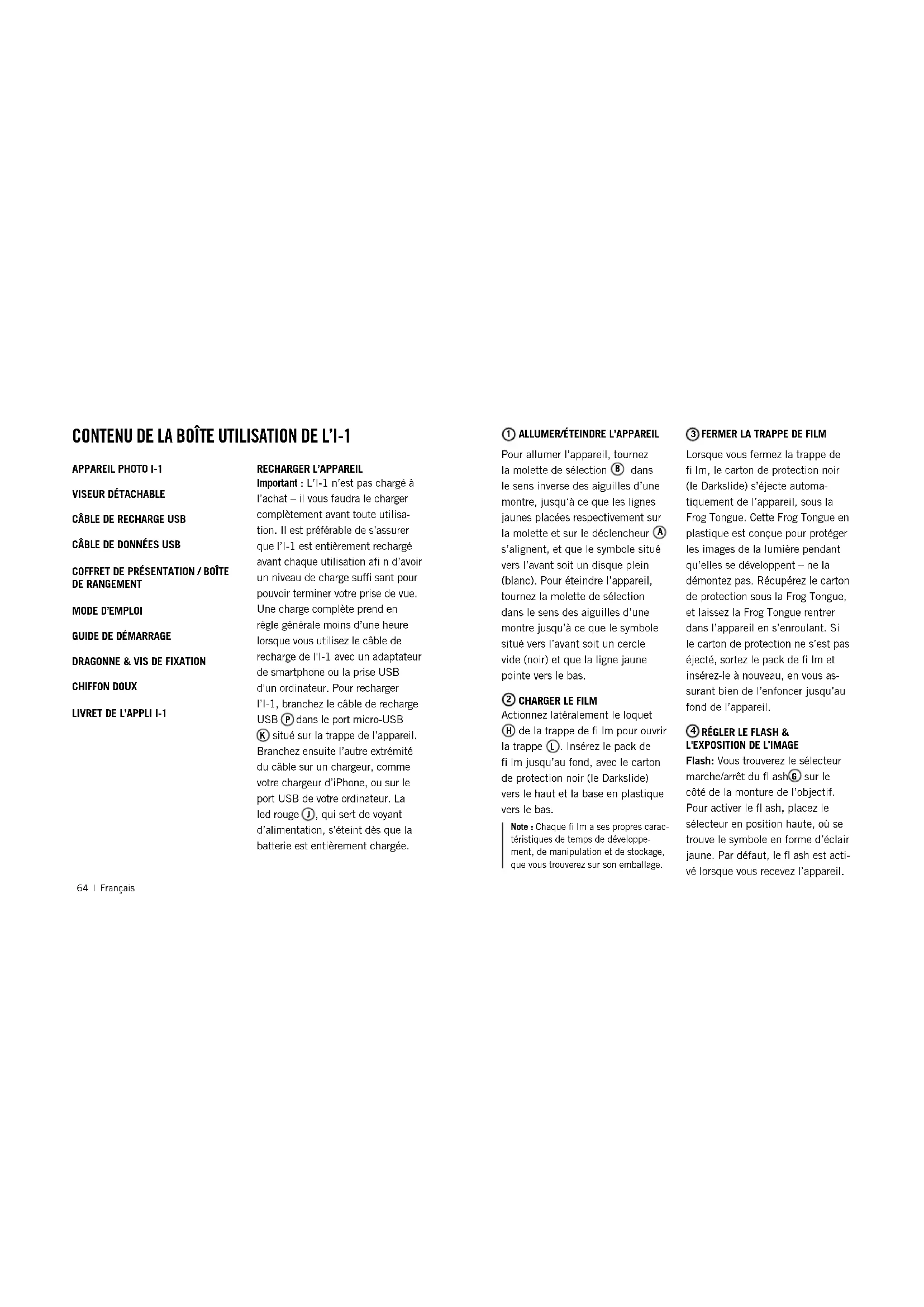 clignote et le fl ash cesse de fonctionner. Dans ce cas, vous ne devriez utili- ser l’appareil que pour des prises de vue en situation de très forte luminosité et de soleil direct. Important : Les besoins en énergie du fl ash annulaire étant conséquents, nous vous recommandons de recharger l’I-1 avant toute utilisation, pendant environ une heure, en utilisant le câble de recharge de l'I-1. FILM COMPATIBLE L’I-1 fonctionne avec tous les fi lms Impossible de type 600 et de type I, en couleur comme en noir & blanc.