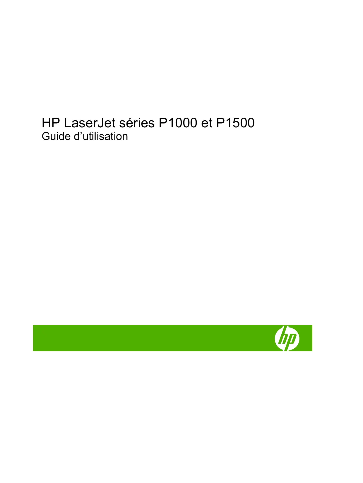 - HP LaserJet séries P1000 et P1500 Guide d’utilisation HP LaserJet séries P1000 et P1500 Guide d’utilisation Copyright et licence Marques © 2007 Copyright Hewlett-Packard Development Company, L.P. Microsoft®, Windows®et Windows NT® sont des marques déposées de Microsoft Corporation aux Etats-Unis. Il est interdit de reproduire, adapter ou traduire ce manuel sans autorisation expresse par écrit, sauf dans les cas permis par les lois régissant les droits d'auteur. Les informations contenues dans ce document sont susceptibles d'être modifiées sans préavis. Les seules garanties des produits et services HP sont exposées dans les clauses expresses de garantie fournies avec les produits ou services concernés. Le contenu de ce document ne constitue en aucun cas une garantie supplémentaire. HP ne peut être tenu responsable des éventuelles erreurs techniques ou éditoriales de ce document. Numéro de référence : CB410-90996 Edition 1, 12/2007 PostScript® est une marque déposée d’Adobe Systems Incorporated. Sommaire 1 Informations sur le produit Configurations du produit p. 2