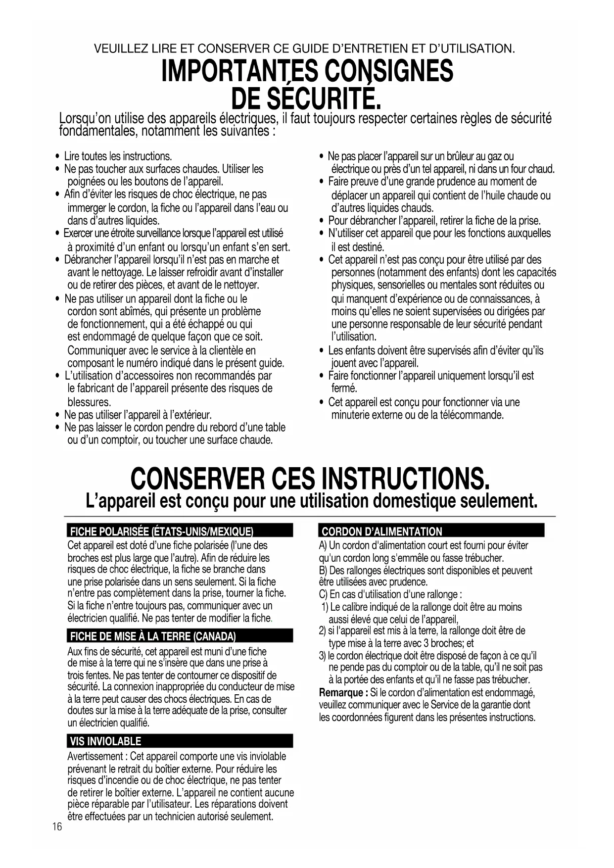 ne pende pas du comptoir ou de la table, qu’il ne soit pas à la portée des enfants et qu’il ne fasse pas trébucher. Remarque : Si le cordon d’alimentation est endommagé, veuillez communiquer avec le Service de la garantie dont les coordonnées gurent dans les présentes instructions. VEUILLEZ LIRE ET CONSERVER CE GUIDE D’ENTRETIEN ET D’UTILISATION. IMPORTANTES CONSIGNES DE SÉCURITÉ. Lorsqu’on utilise des appareils électriques, il faut toujours respecter certaines règles de sécurité fondamentales, notamment les suivantes : CONSERVER CES INSTRUCTIONS. L’appareil est conçu pour une utilisation domestique seulement.16