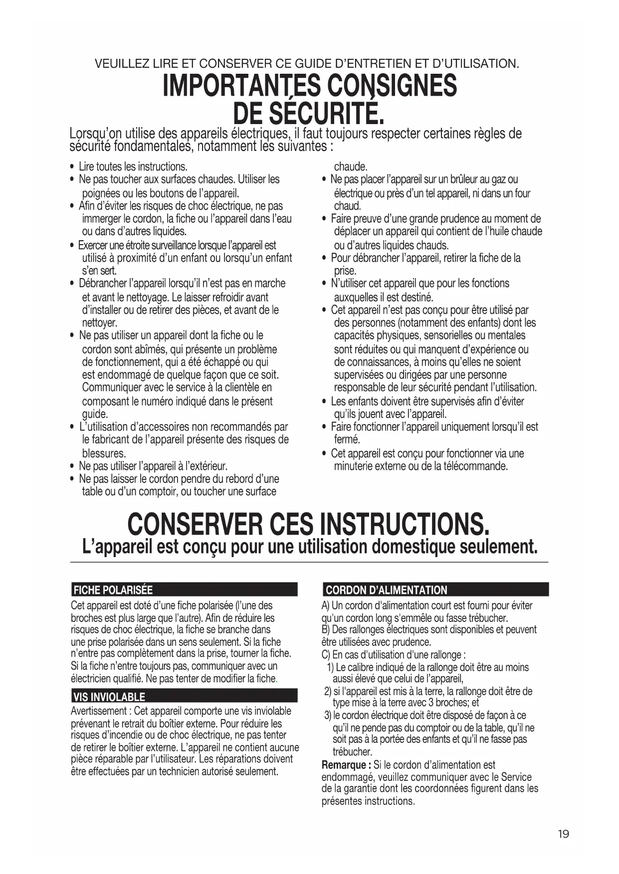 qu’il ne pende pas du comptoir ou de la table, qu’il ne soit pas à la portée des enfants et qu’il ne fasse pas trébucher. Remarque : Si le cordon d’alimentation est endommagé, veuillez communiquer avec le Service de la garantie dont les coordonnées gurent dans les présentes instructions. VEUILLEZ LIRE ET CONSERVER CE GUIDE D’ENTRETIEN ET D’UTILISATION. IMPORTANTES CONSIGNES DE SÉCURITÉ. Lorsqu’on utilise des appareils électriques, il faut toujours respecter certaines règles de sécurité fondamentales, notamment les suivantes : CONSERVER CES INSTRUCTIONS. L’appareil est conçu pour une utilisation domestique seulement.20