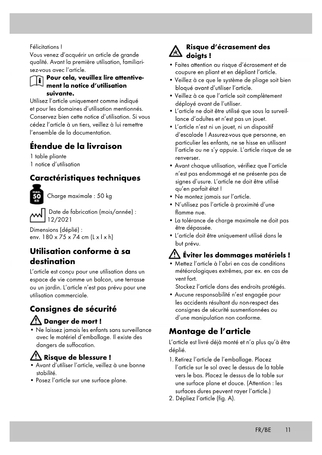 - s‘il présente les qualités qu‘un acheteur peut légitimement attendre eu égard aux déclara- tions publiques faites par le vendeur, par le producteur ou par son représentant, notam- ment dans la publicité ou l‘étiquetage ; 2° Ou s‘il présente les caractéristiques définies d‘un commun accord par les parties ou être propre à tout usage spécial recherché par l‘acheteur, porté à la connaissance du vendeur et que ce dernier a accepté. Article L217-12 du Code de la consommation L‘action résultant du défaut de conformité se prescrit par deux ans à compter de la délivrance du bien. Article 1641 du Code civil Le vendeur est tenu de la garantie à raison des défauts cachés de la chose vendue qui la rendent impropre à l‘usage auquel on la destine, ou qui diminuent tellement cet usage que l‘acheteur ne l‘aurait pas acquise, ou n‘en aurait donné qu‘un moindre prix, s‘il les avait connus. Article 1648 1er alinéa du Code civil L‘action résultant des vices rédhibitoires doit être intentée par l‘acquéreur dans un délai de deux ans à compter de la découverte du vice. Les pièces détachées indispensables à l’utili- sation du produit sont disponibles pendant la durée de la garantie du produit. IAN : 364927_2107 Service France Tel. : 0800 919270 E-Mail : deltasport@lidl.fr Service Belgique Tel. : 070 270 171 (0,15 EUR/Min.) E-Mail : deltasport@lidl.be FR/BE14 Gefeliciteerd! Met uw aankoop hebt u voor een hoogwaardig artikel gekozen. Zorg ervoor dat u voor het eerste gebruik met het artikel vertrouwd raakt. Lees hiervoor de volgende gebruiksaanwijzing zorgvuldig door. Gebruik het artikel alleen zoals omschreven en voor het aangegeven doel. Bewaar deze ge- bruiksaanwijzing goed. Geef alle documenten mee als u het artikel aan iemand anders geeft. Leveringsomvang 1 x klaptafel 1 x gebruiksaanwijzing Technische gegevens Maximale belasting: 50 kg Productiedatum (maand/jaar): 12/2021 Afmetingen (uitgeklapt): ca. 180 x 75 x 74 cm (l x b x h) Beoogd gebruik Dit artikel is ontworpen voor gebruik in de huise- lijke sfeer, bijv. op het balkon, op het terras of in de tuin. Het artikel is niet bestemd voor zakelijk gebruik. Veiligheidstips Levensgevaar!